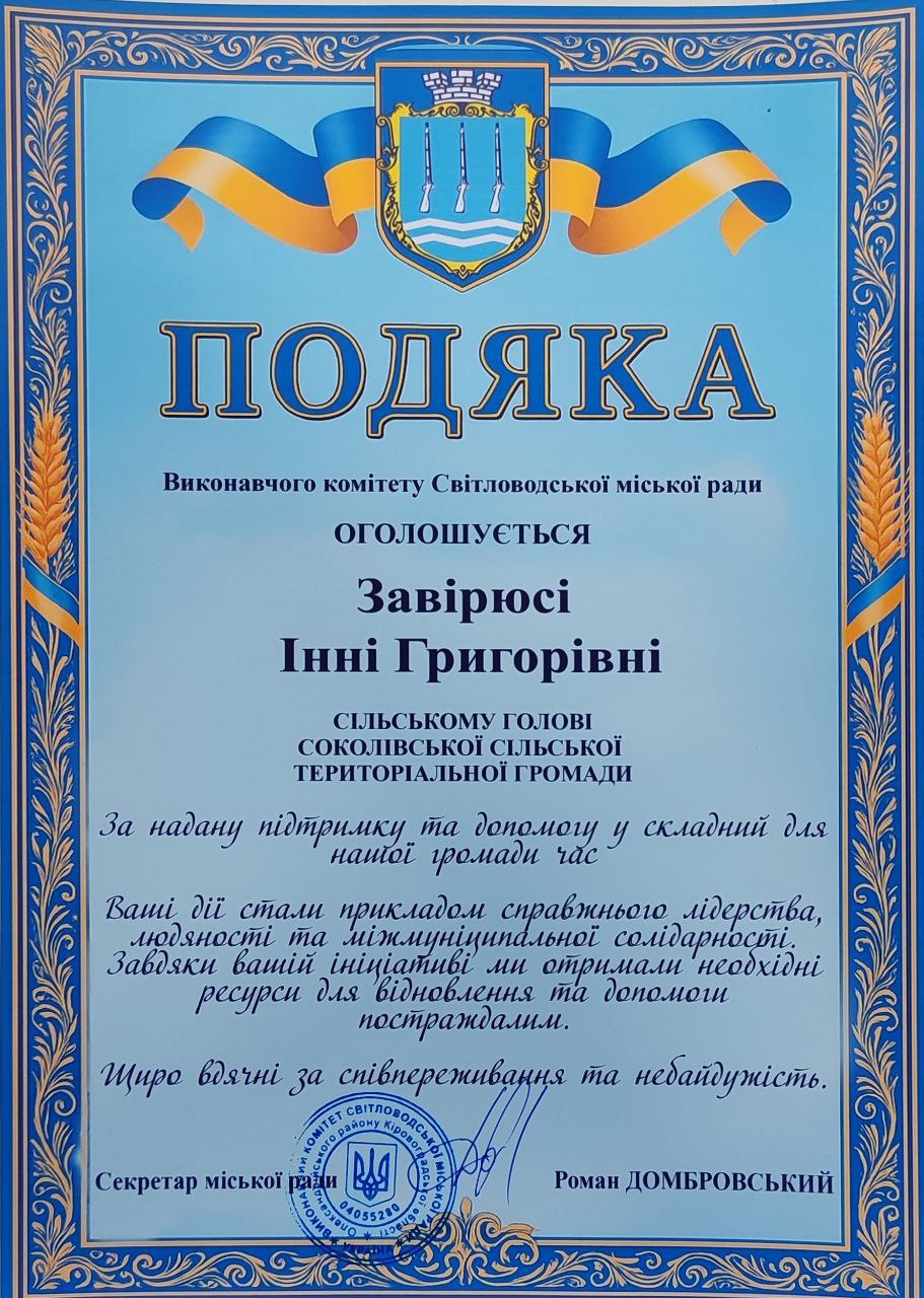 Секретар Світловодської міської ради Роман Домбровський подякував Соколівському сільському голові Інні Завірюсі та жителям Соколівської громади за допомогу і підтримку жителів Світловодська після ворожого ракетного обстрілу, який місто пережило у травні цього року.