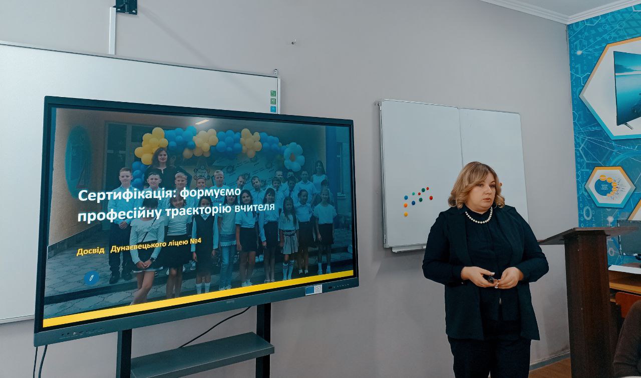 Історіями успіху сертифікації ділилися Анастасія Шульга (вчитель історії Дунаєвецького ліцею №3), Алла Сварчевська (вчитель початкових класів Дунаєвецького ліцею №4) – педагоги, які успішно пройшли сертифікацію-2025.