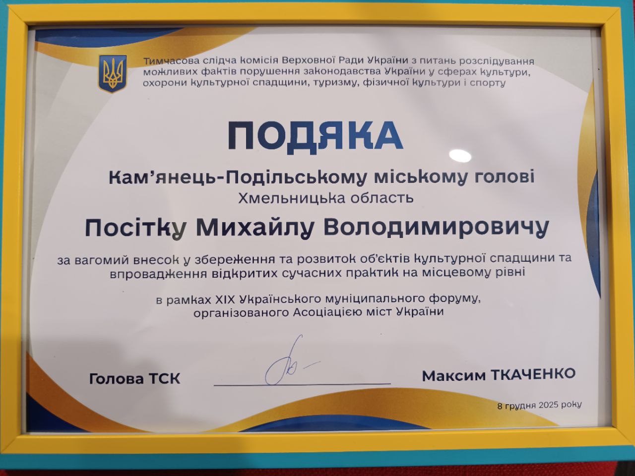 Приємно відзначити: Кам’янець-Подільській громаді є чим поділитися та чим пишатися на всеукраїнському рівні! Підтвердженням цьому стала чергова висока відзнака, яку отримав Кам’янець-Подільський міський голова Михайло Посітко. Нагорода присуджена за впровадження відкритих сучасних практик на місцевому рівні, а також за збереження та розвиток об’єктів культурної спадщини.