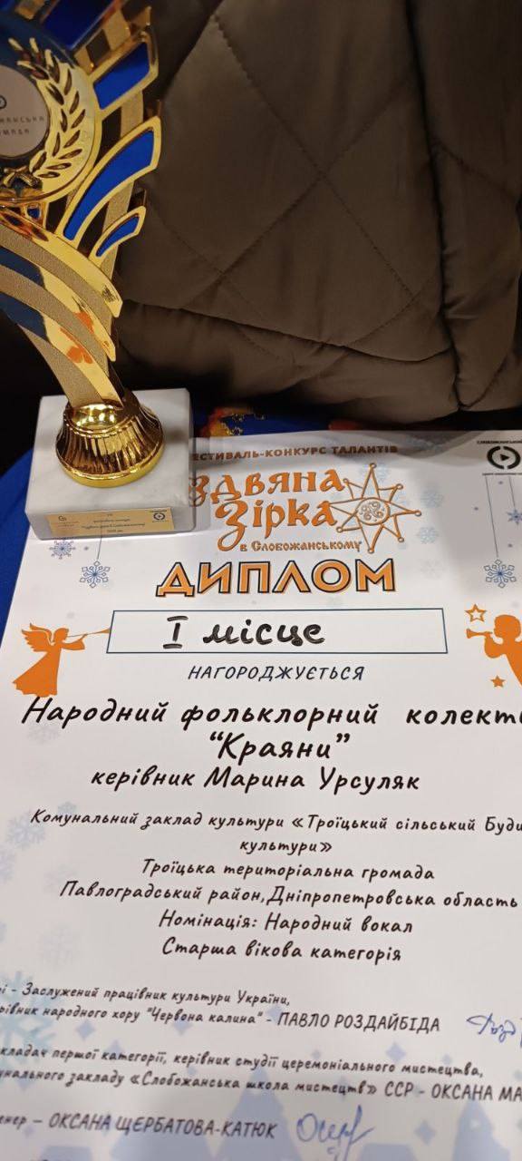 Вітаємо колектив народного аматорського фольклорного колективу “Краяни” Троїцького СБК з перемогою на восьмому-фестивалі конкурсі “Різдвяна зірка в Слобожанському” та зайняте перше почесне місце.