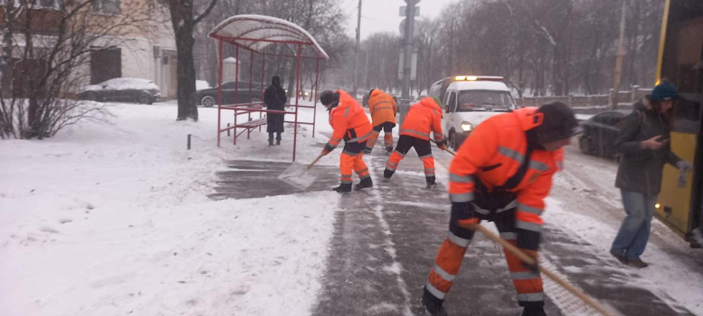 КП ШЕУ Голосіївського району залучило до прибирання 42 одиниць техніки, 63 працівники залучені до обробки зупинкових комплексів, наземних та підземних пішохідних переходів та сходів.