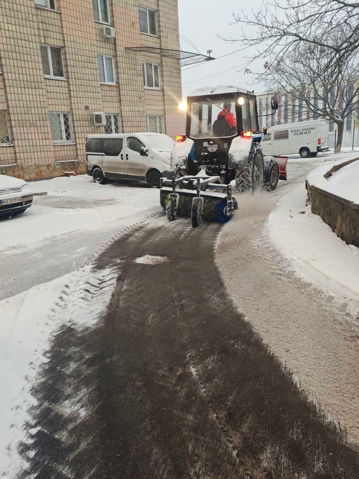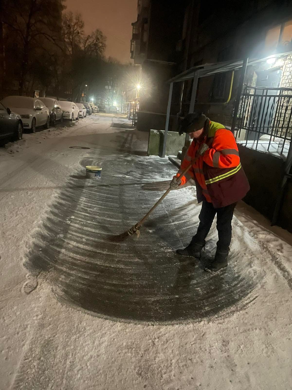 У Голосіївському районі для очищення прибудинкових територій та оброблення протиожиледними засобами залучено 224 робітників працівників КП «Керуюча компанія з обслуговування житлового фонду Голосіївського району» з комплексного прибирання будинків та 11 одиниць техніки.