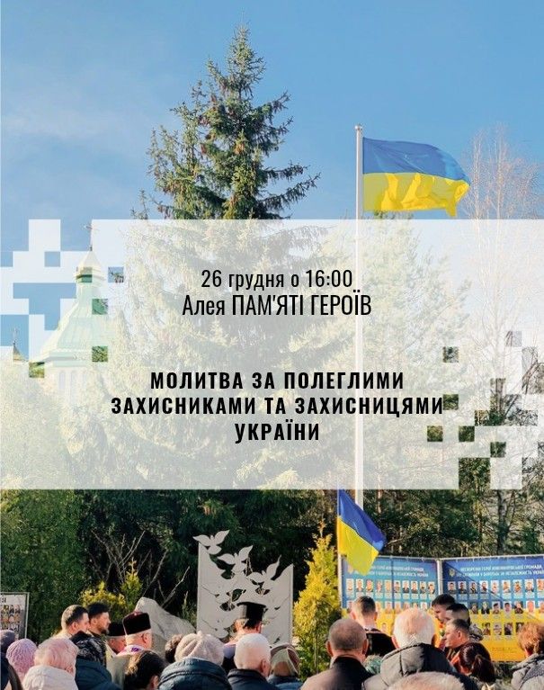 У п’ятницю, 26 грудня, о 16:00 на Алеї пам’яті Героїв відбудеться традиційна спільна молитва за наших Захисників і Захисниць, які віддали життя за свободу та незалежність України.