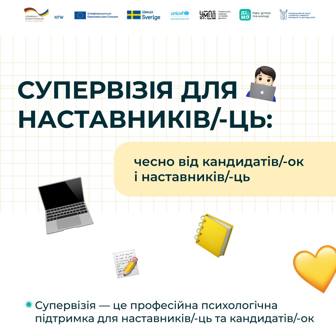 ℹ️Супервізії наставникам і наставницям надаються в межах проєкту “Підтримка дітей і молоді з досвідом перебування в альтернативних формах догляду”, що реалізується ЮНІСЕФ спільно з ГС “Українська мережа за права дитини” та Офісом дітей та молоді «ДІйМО» при Міністерстві соціальної політики, сім’ї та єдності України за фінансової підтримки Федерального міністерства економічного співробітництва і розвитку Німеччини (BMZ) через державний банк розвитку KfW, Європейського Союзу та Уряду Швеції.