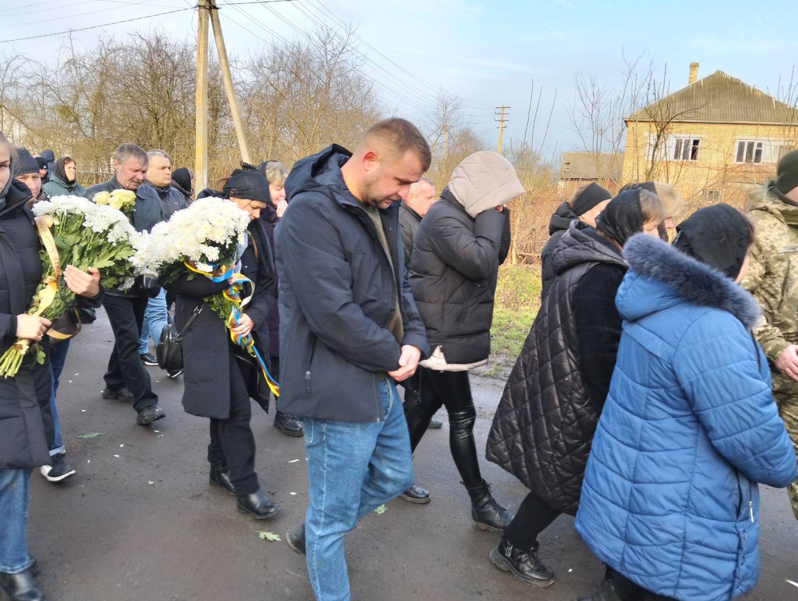 На колінах із сльозами на очах, з вдячністю за мужність та відданість тіло загиблого воїна проводжали його земляки, священнослужителі, військовослужбовці, представники громади, побратими, друзі, найближчі та найрідніші люди.