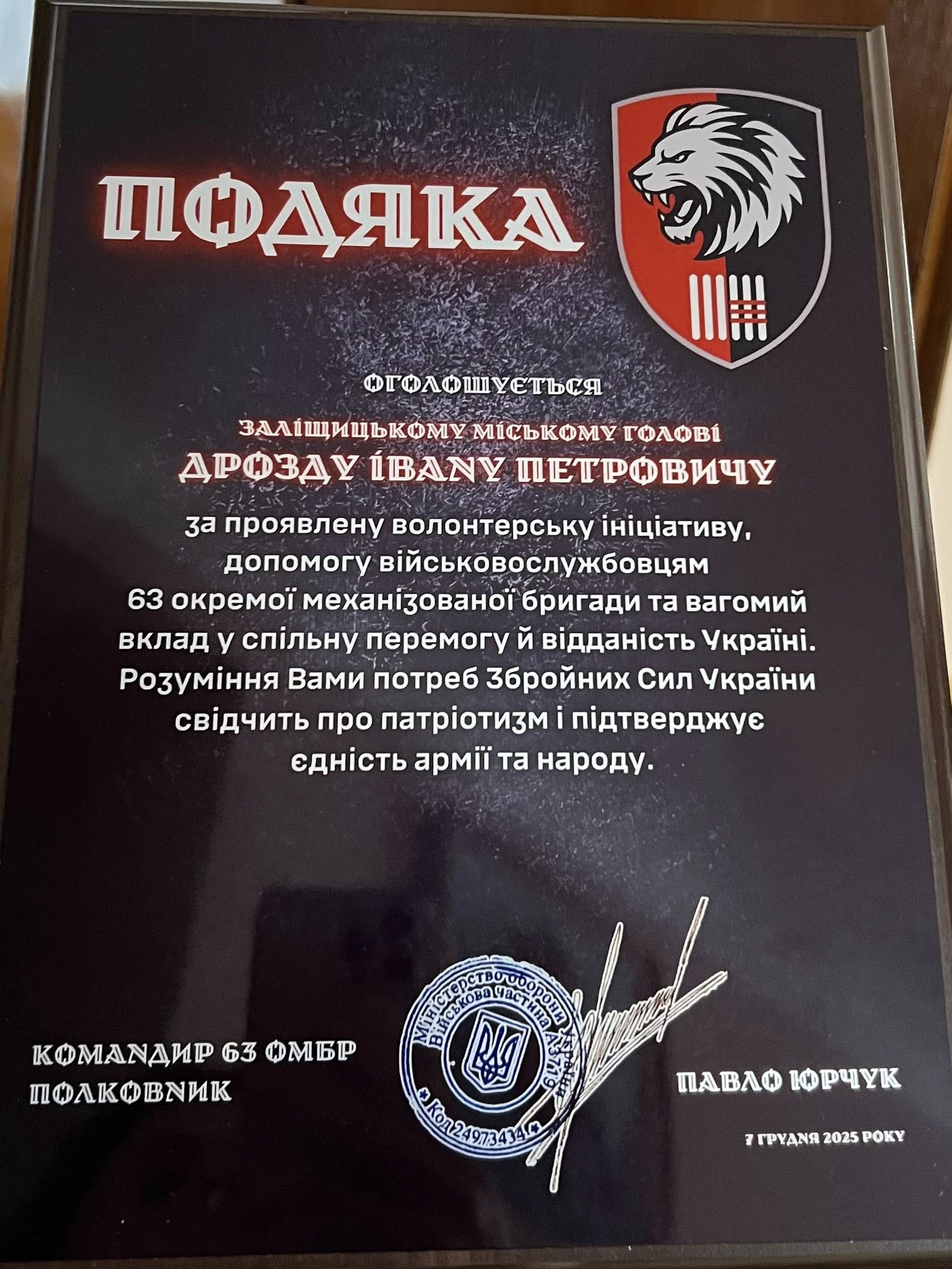 Сьогодні відбулася зустріч із військовослужбовцем 63 окремої механізованої бригади, під час якої міському голові Івану Дрозду було вручено подяку за проявлену волонтерську ініціативу, постійну підтримку захисників та вагомий внесок у спільну Перемогу.