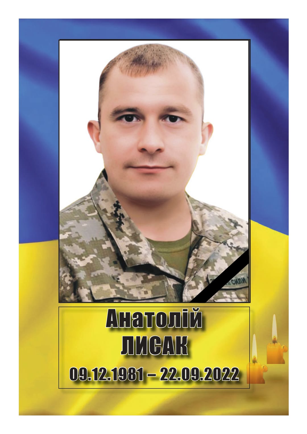🕯️22 вересня 2022 року, виконуючи бойове завдання у населеному пункті Миколаївка Донецької області, Лисак Анатолій загинув.