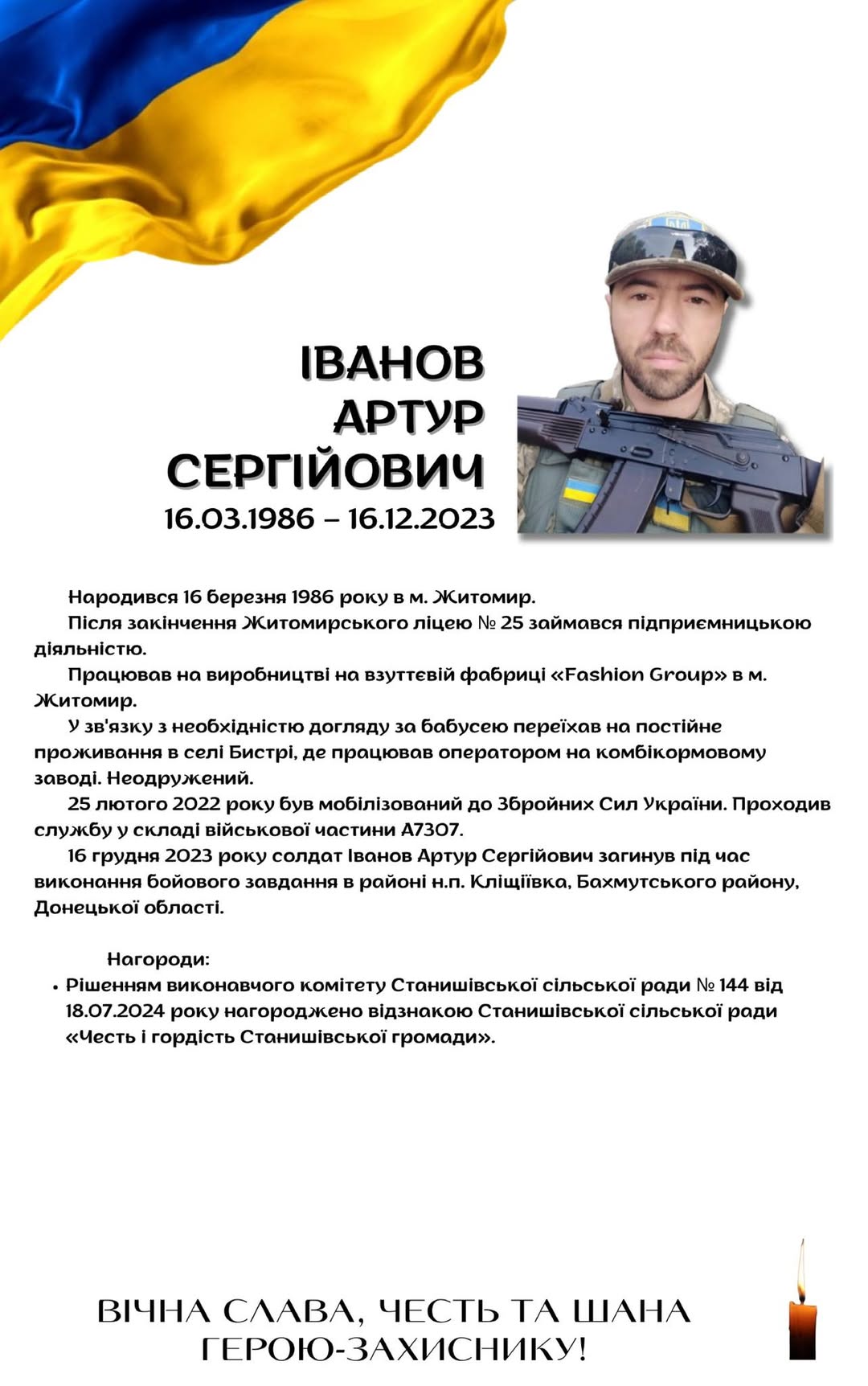 🇺🇦Сьогодні минає друга річниця, як загинув 🕯️ Іванов Артур Сергійович, 16.03.1986-16.12.2023