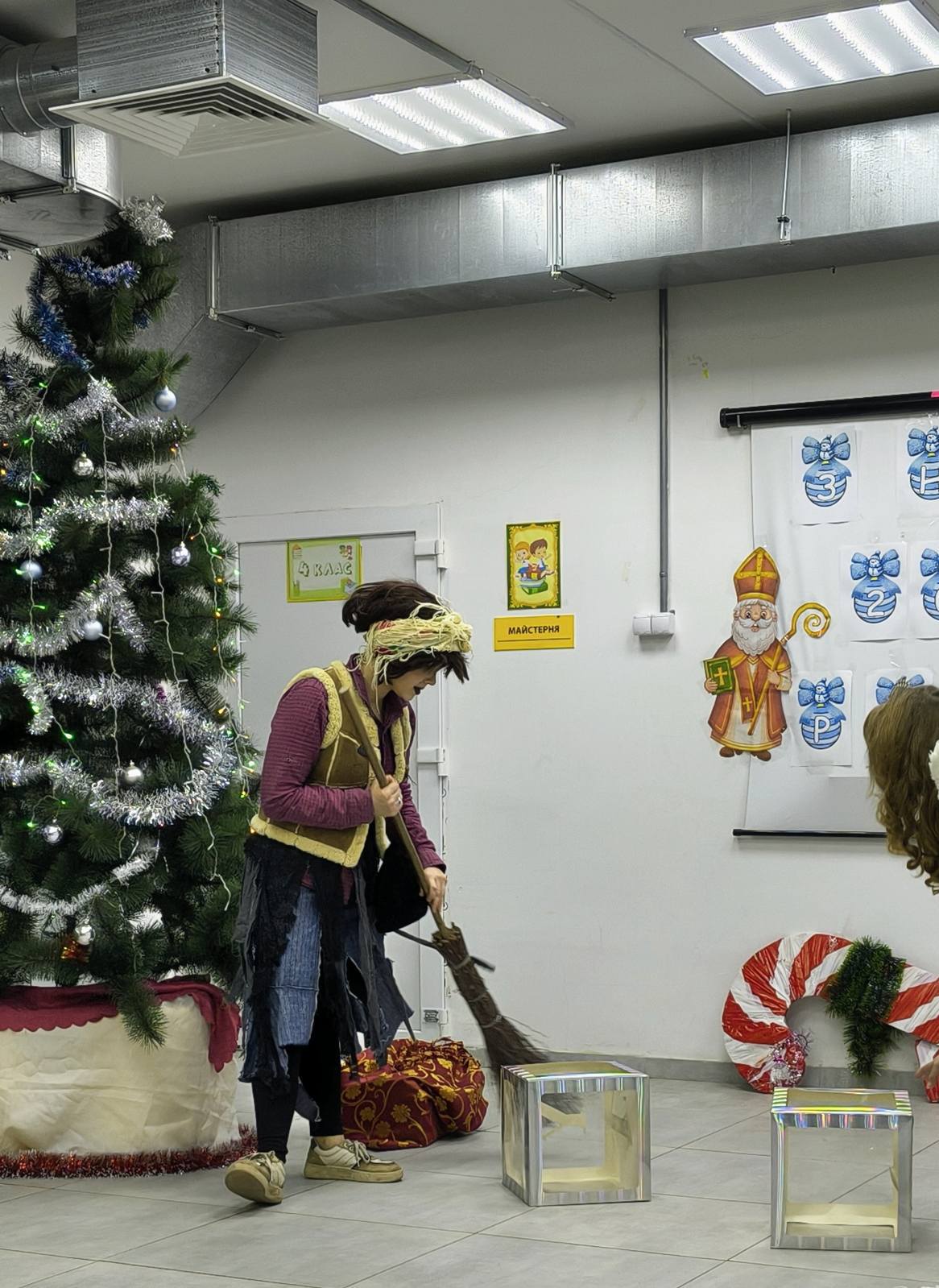 Для наших наймолодших школярів засяяла вогниками шкільна лісова красуня! Казкові герої та Святий Миколай підготували для дітлахів руханки, хороводи, загадували загадки та проводили конкурси. А діти в свою чергу подарували усім новорічні пісеньки та віршики. Зрештою під впливом дитячих усмішок та святкового настрою навіть Баба Яга подобрішала, повернула «викрадений» мішок із солодкими подарунками.