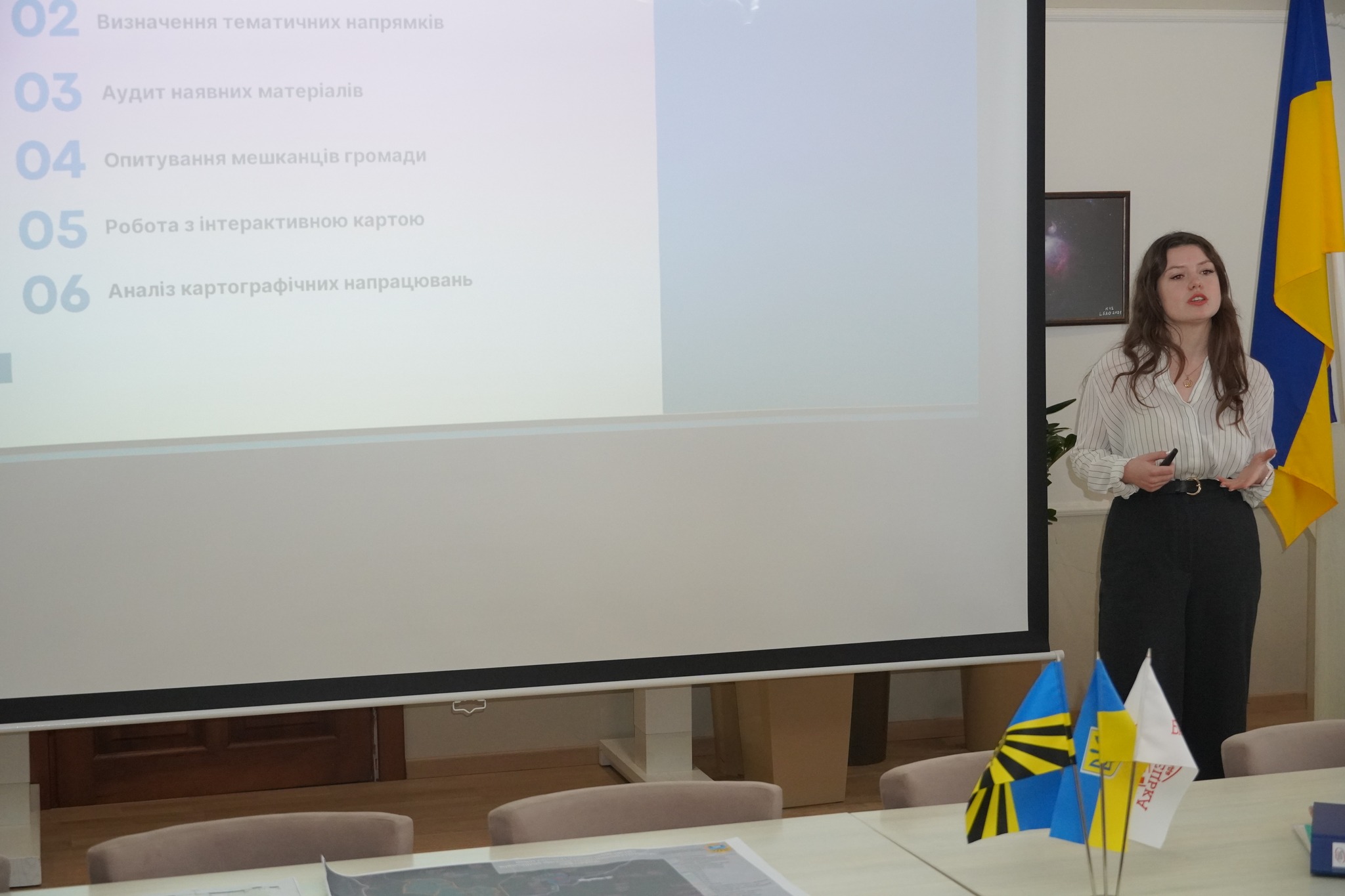 Цікавим був один з розділів їхньої презентації, який стосувався тематичних напрямків розвитку території громади. Мова йшла про архітектурно-планувальну структуру території, про території з особливими перспективами розвитку, про функціональне зонування, просторову композицію та інженерне забезпечення території.
