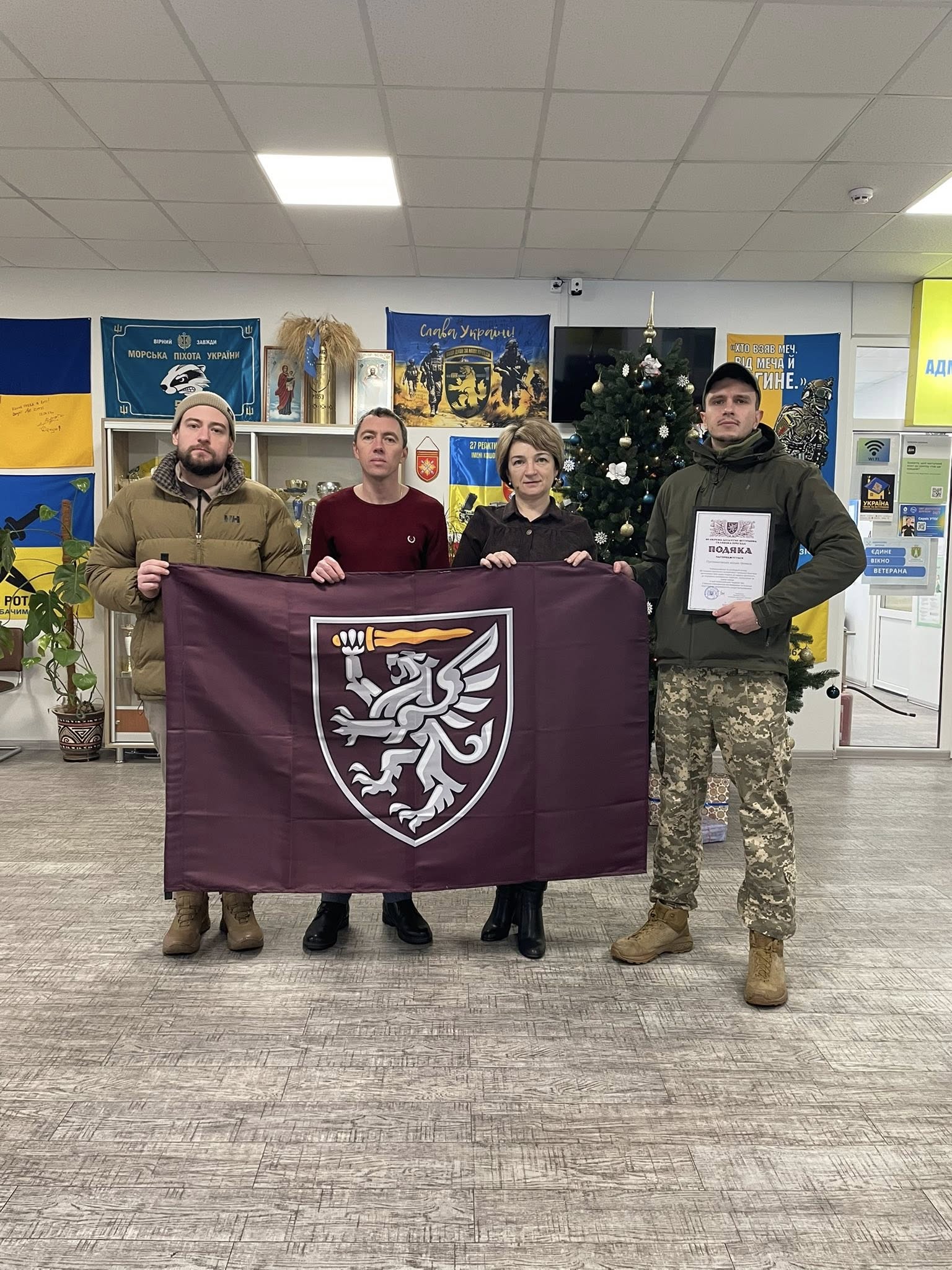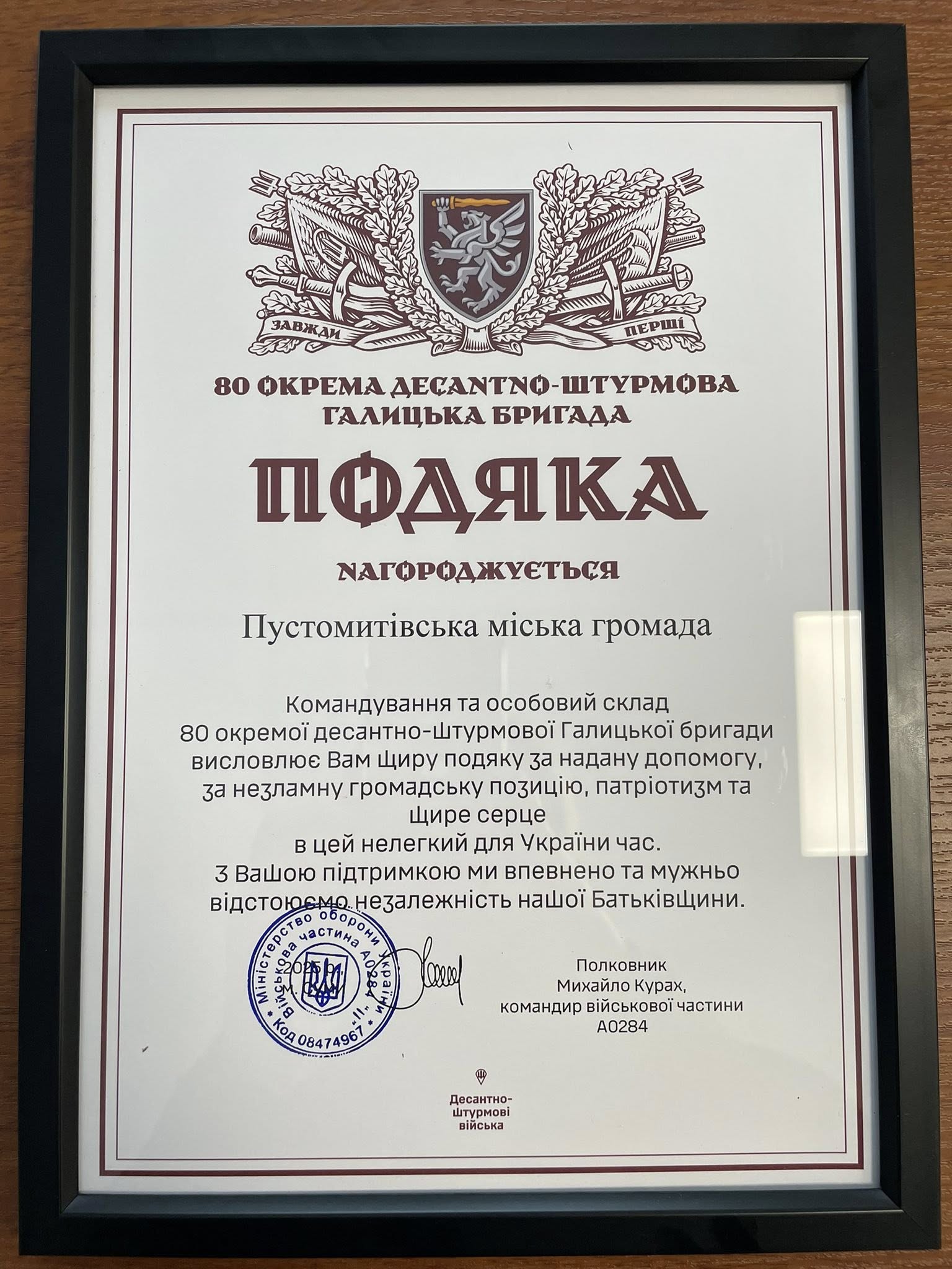 Наші захисники вручили Пустомитівській територіальній громаді подяку та прапор за надану допомогу, за незламну громадську позицію, патріотизм та щире серце в цей нелегкий для України час. Ці символи вдячності від командування та особового складу отримали перша заступниця міського голови Тетяна Голдун та секретар міської ради Тарас Салагай.