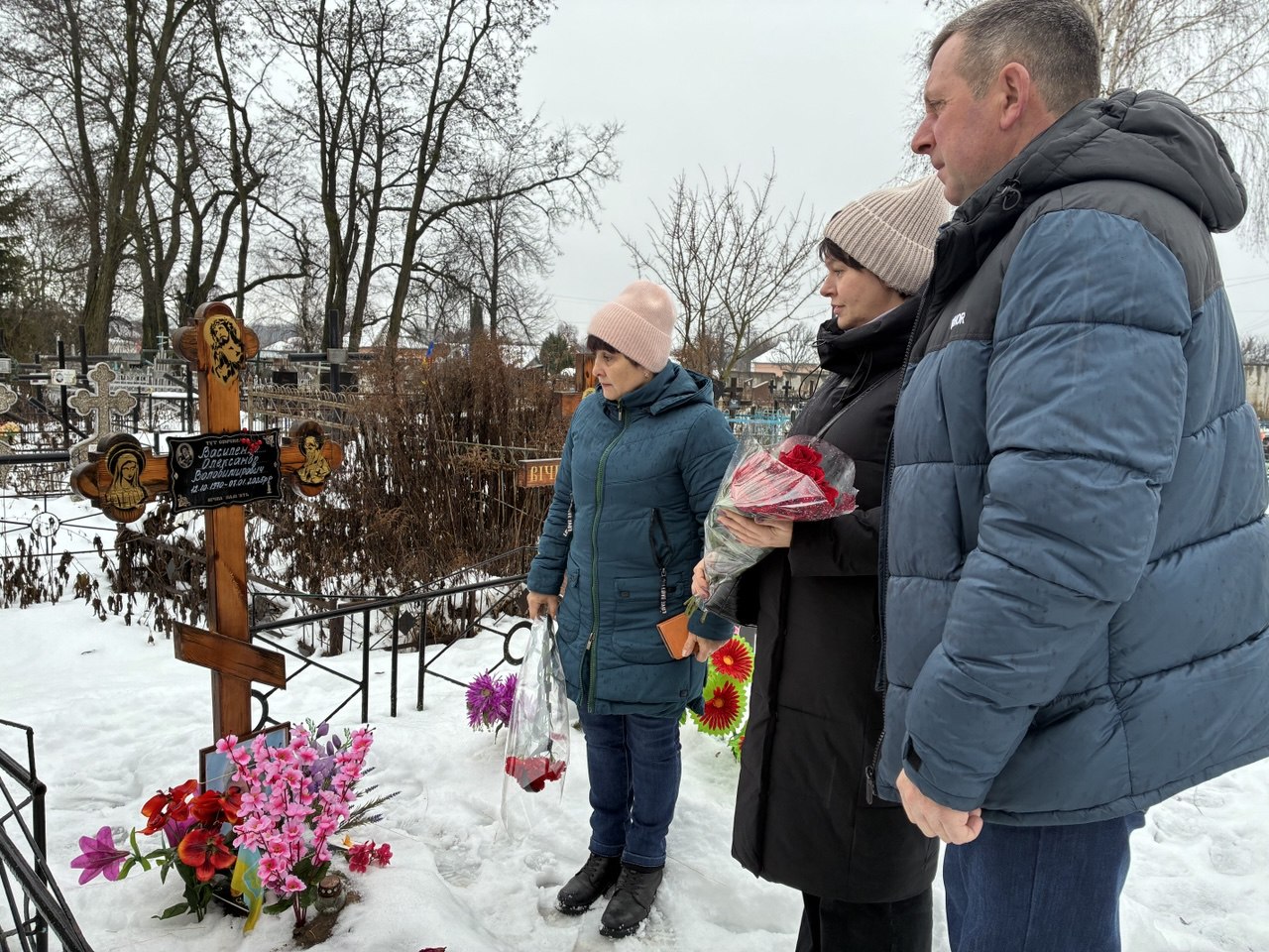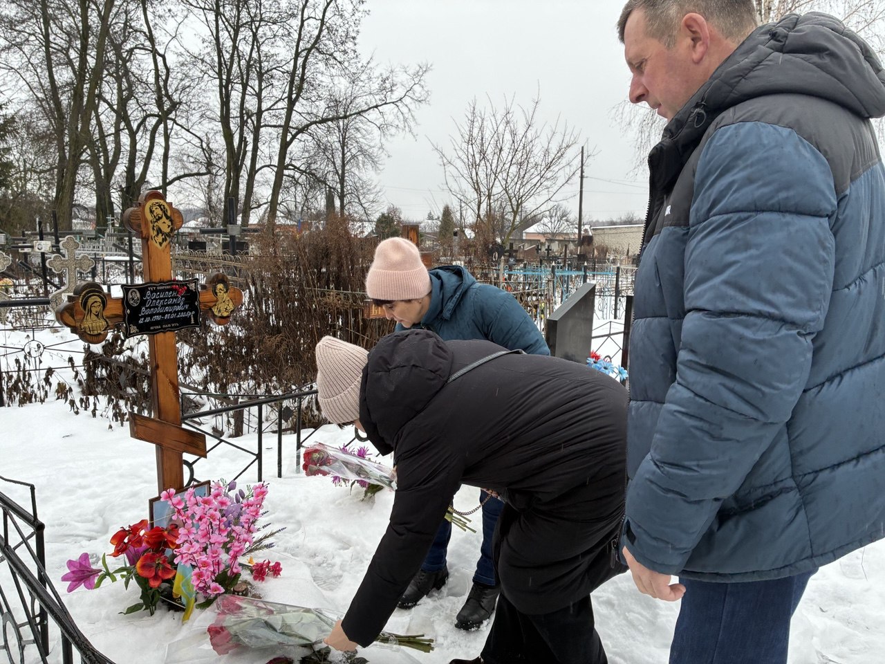 На кладовищі, де похований захисник України, присутні вшанували пам’ять Олександра хвилиною мовчання та поклали квіти до його могили.