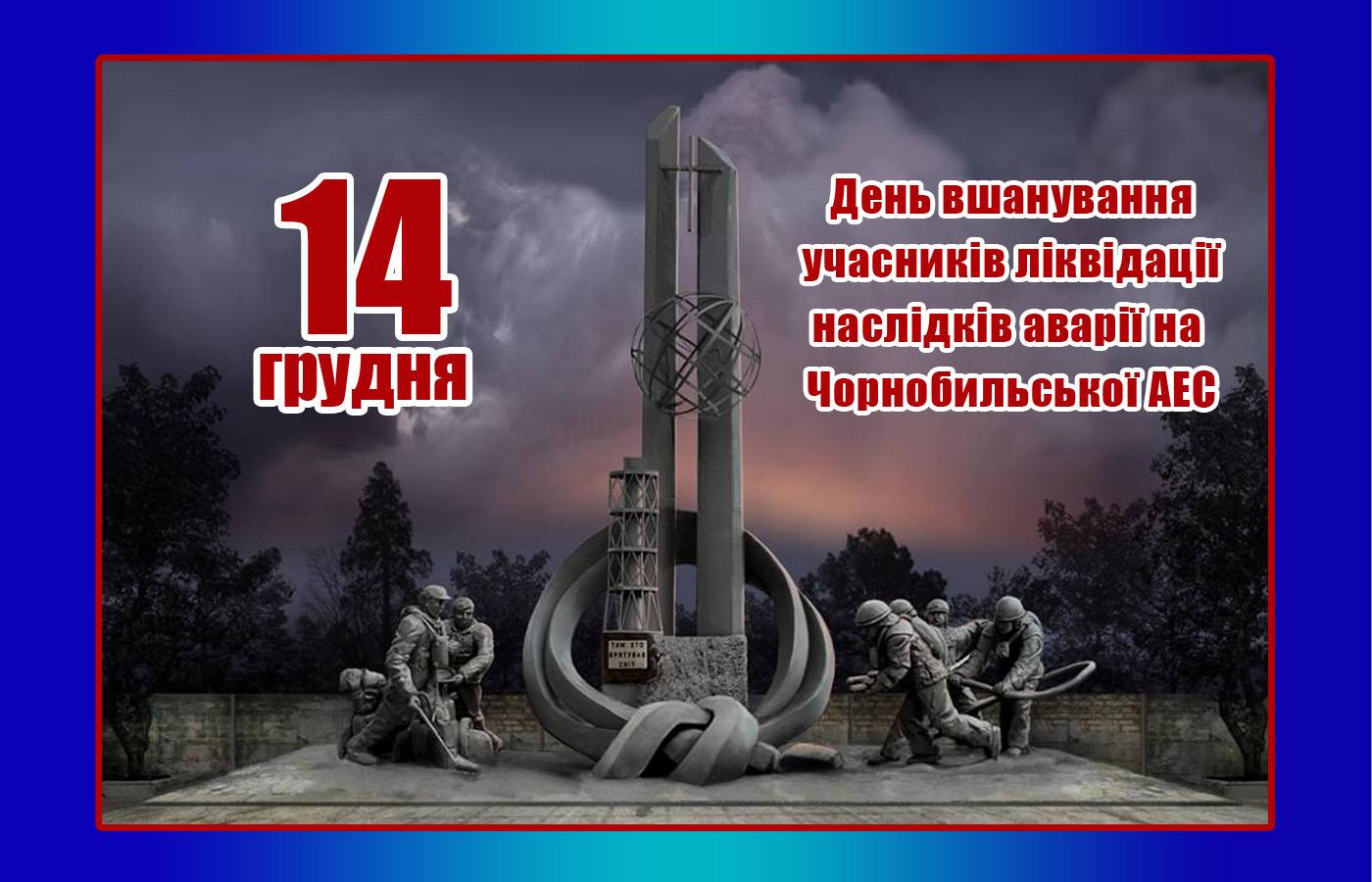 Сьогодні, 14 грудня, ми вшановуємо учасників ліквідації наслідків аварії на Чорнобильській АЕС – надзвичайно мужніх людей, справжніх героїв, які звели до мінімуму, здавалося, невідворотні наслідки небаченої досі техногенної катастрофи.