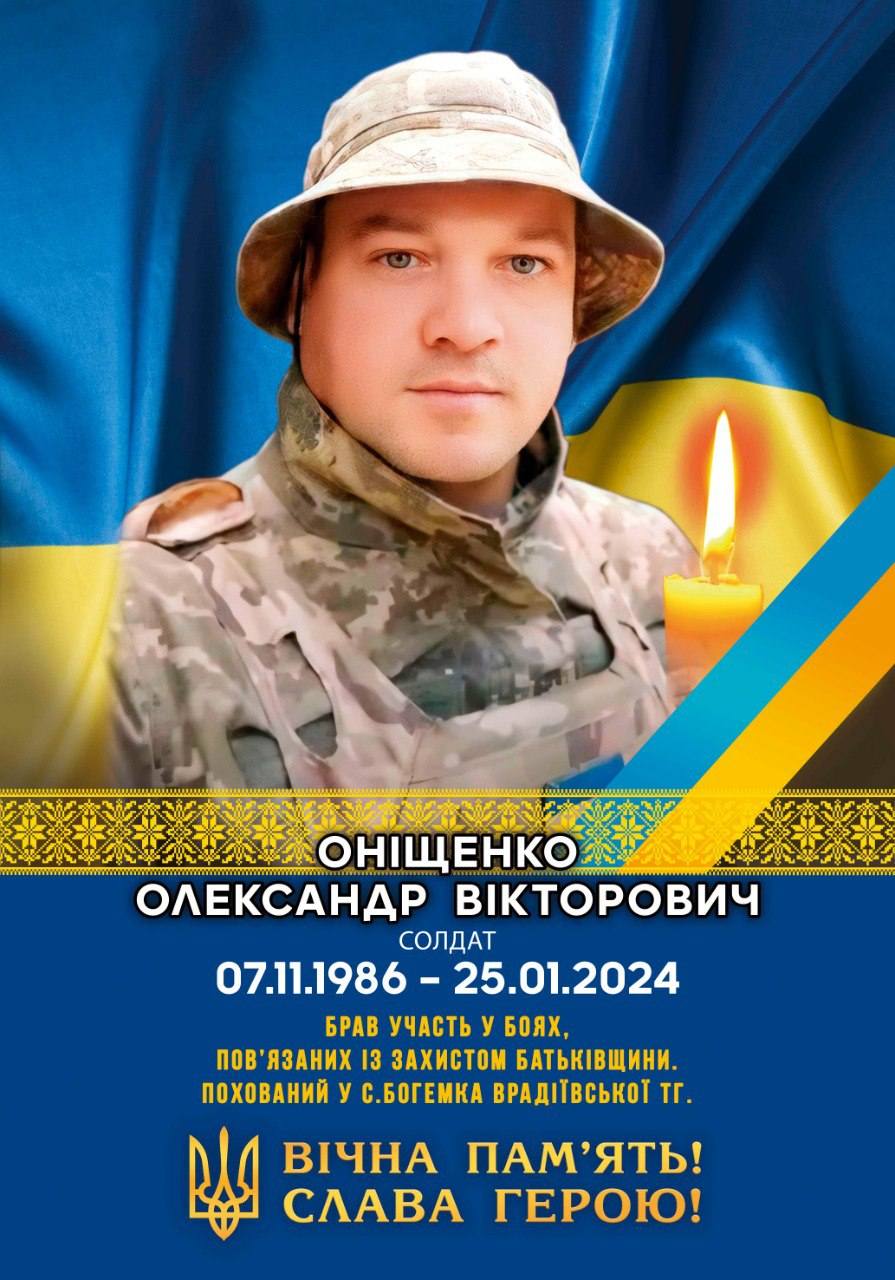 Сьогодні, 25 січня 2026 року виповнюється два роки, як помер наш земляк, Захисник України, солдат Оніщенко Олександр Вікторович. З нагоди другої річниці Врадіївська територіальна громада в цей скорботний день співчуває родині військовослужбовця. Нехай пам’ять про Олександра живе вічно, а його ім’я залишиться у наших серцях. Ми низько схиляємо голови у скорботі та поділяємо ваш біль. Герої не вмирають, вони стають прикладом для нас.