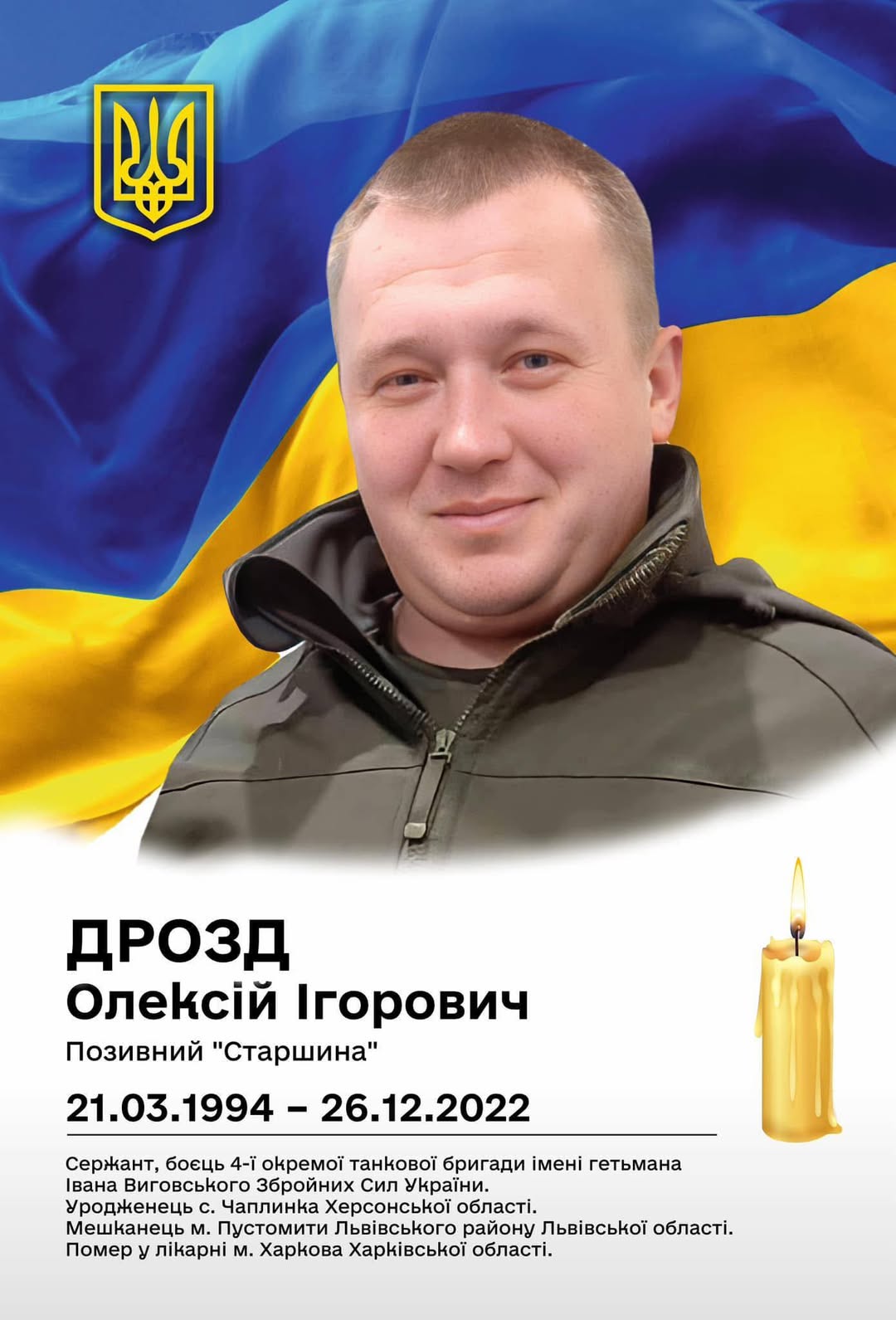 Сьогодні, 26 грудня, минає третя річниця з дня загибелі військовослужбовця Дрозда Олексія Ігоровича ( 21.03.1994 р. н.) уродженця смт. Чаплинка, Херсонської області.