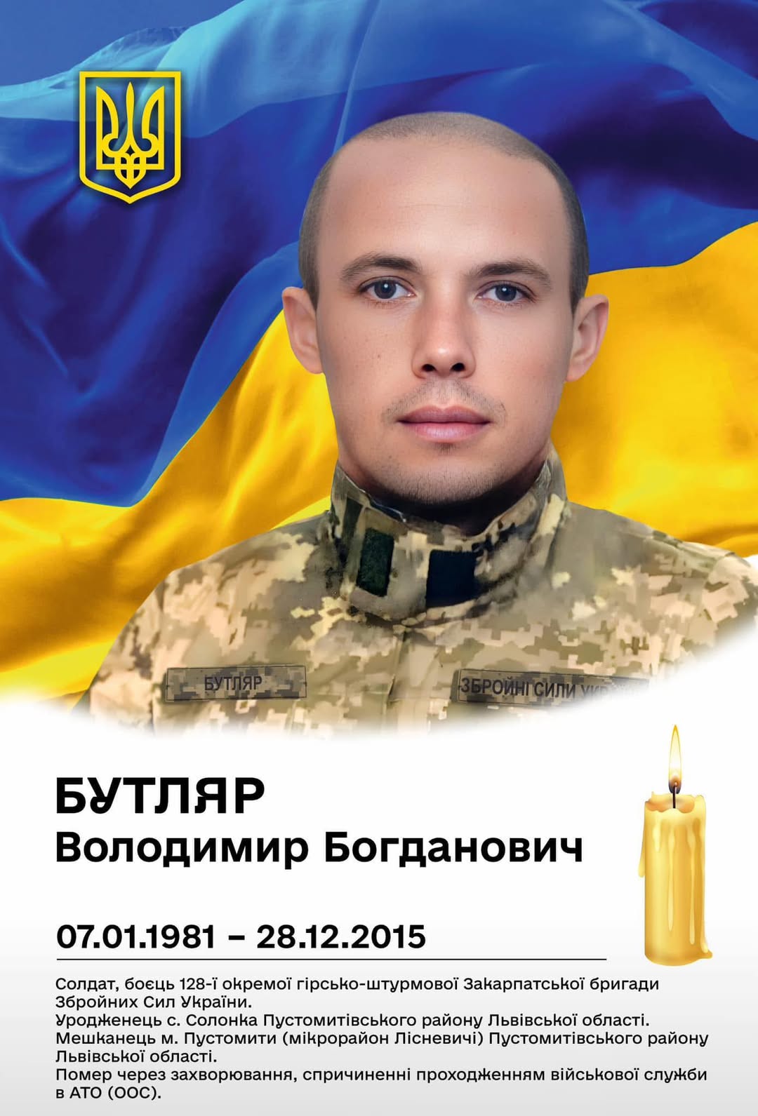 🕯 Сьогодні, 28 грудня 2025 року минають 10 роковини з дня, як загинув військовий, який брав участь у захисті Незалежності, суверенітету та територіальної цілісності України в районі проведення антитерористичної операції у Луганській області Володимир Богданович Бутляр із міста Пустомити (мкр. Лісневичі) (нар. 07.01.1981р).