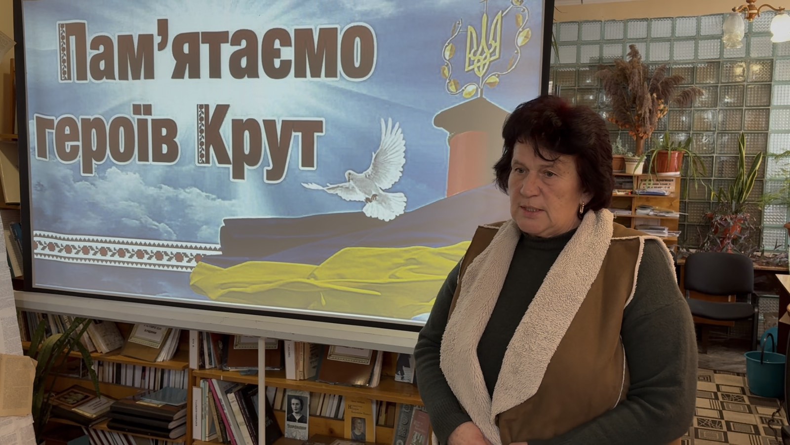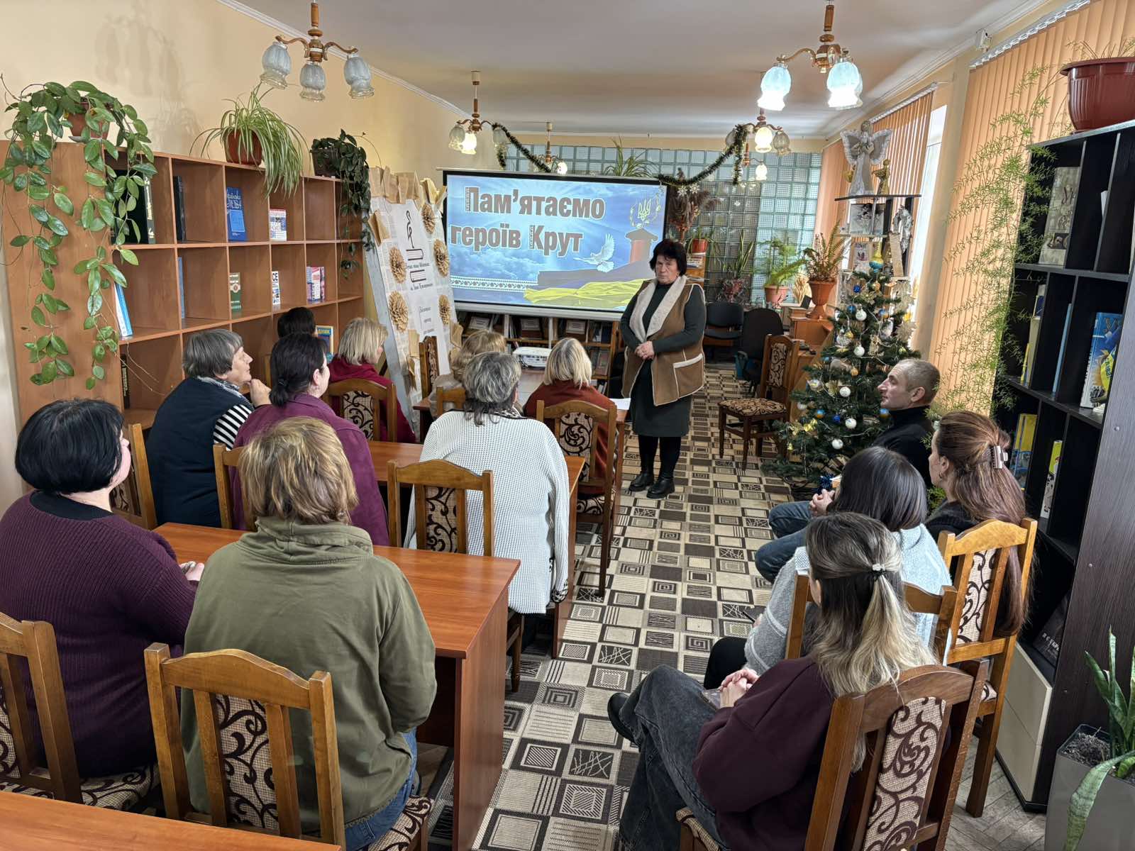 📚 Перед початком перегляду бібліотекар Людмила Михайлюк розповіла присутнім про події, що відбувалися у січні 1918 року біля залізничної станції Крути неподалік Києва. Саме там близько чотирьох сотень київських студентів, гімназистів та юнкерів стали на захист молодої Української Народної Республіки проти значно переважаючих сил більшовицького війська.