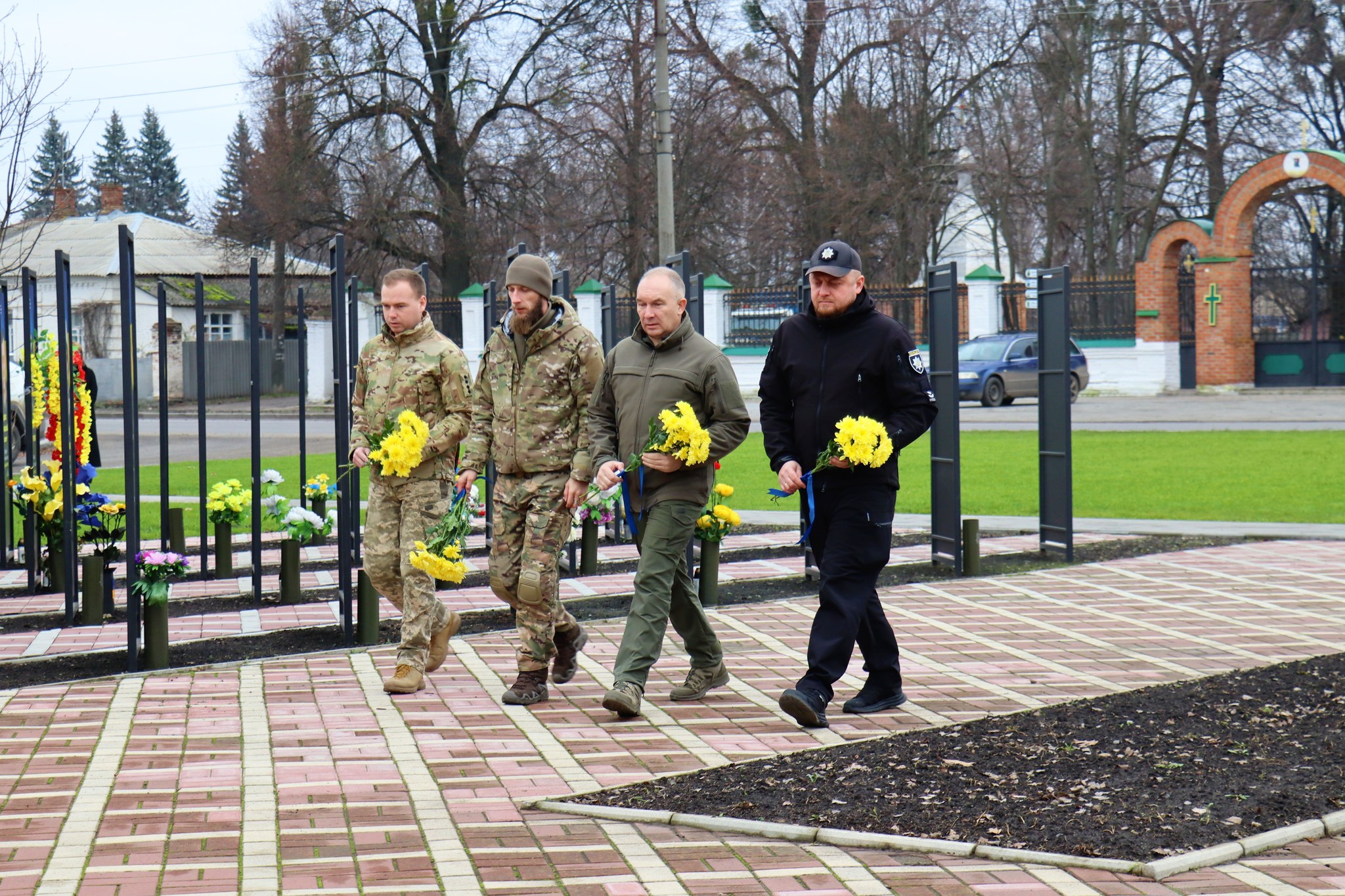 Міський голова Тростянця Юрій Бова разом із представниками ДФТГ «Тростянець-1», працівниками поліції та військовослужбовцями першого відділення територіального центру комплектування й соціальної підтримки вшанували пам’ять полеглих героїв хвилиною мовчання.