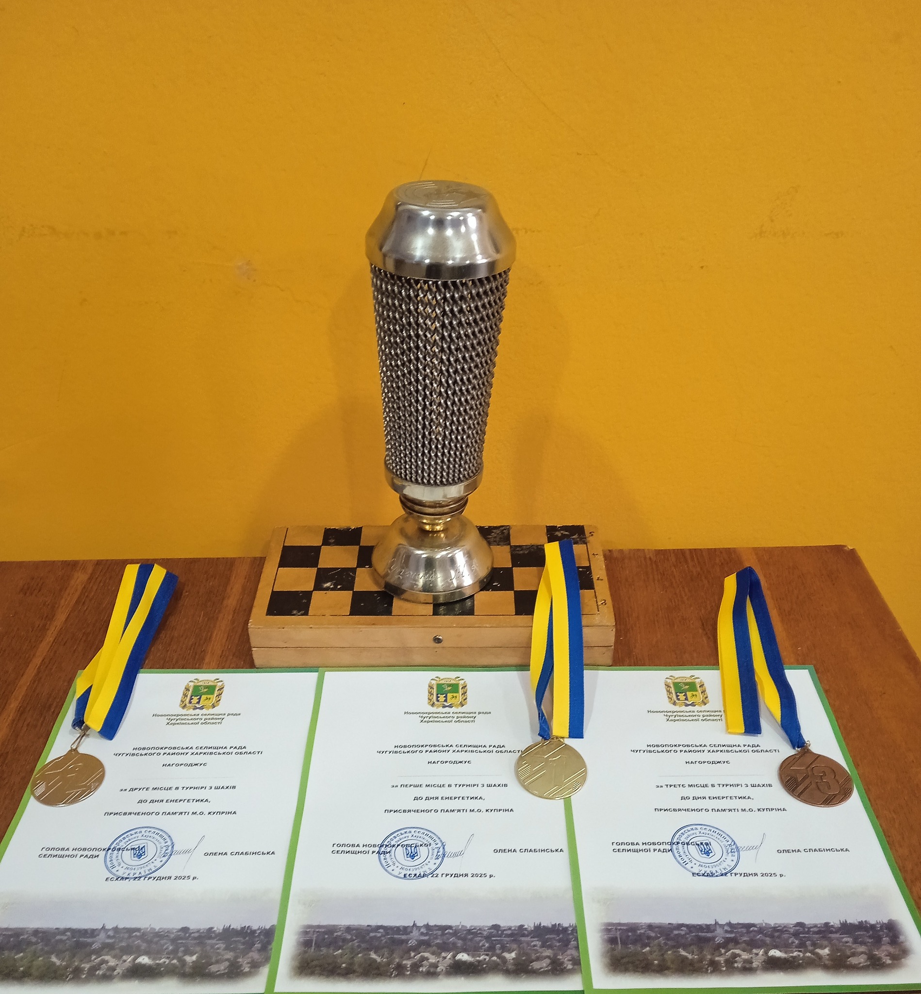 Велика подяка голові Новопокровської селищної ради Олені Сергіївні Слабінській, КУ Харківський обласний центр фізичного здоровя населення “Спорт для всіх”, за допомогу надану в організації проведення турніру з шахів до Дня енергетика, присвяченого пам’яті Михайла Олексійовича Купріна, начальнику відділу освіти, культури, спорту та молоді Евеліні Олександрівні Царевській, директору КЗ “Центр культури і дозвілля” Юрію Миколайовичу Рудавіну і працівникам Есхарівського Будинку Культури за місце надане для проведення змагань.