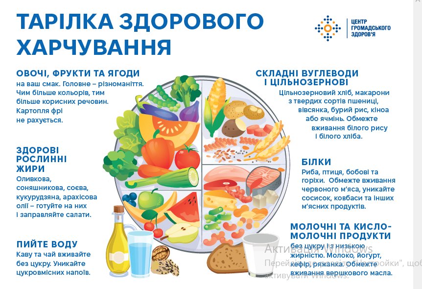 Тарілка здорового харчування — це візуальна модель, розроблена Гарвардською школою громадського здоров’я, яка показує ідеальні пропорції продуктів для збалансованого прийому їжі: 50% (половина тарілки) — овочі та фрукти, 25% (чверть) — цільнозернові продукти (складні вуглеводи), і ще 25% — білки (риба, птиця, бобові, горіхи).