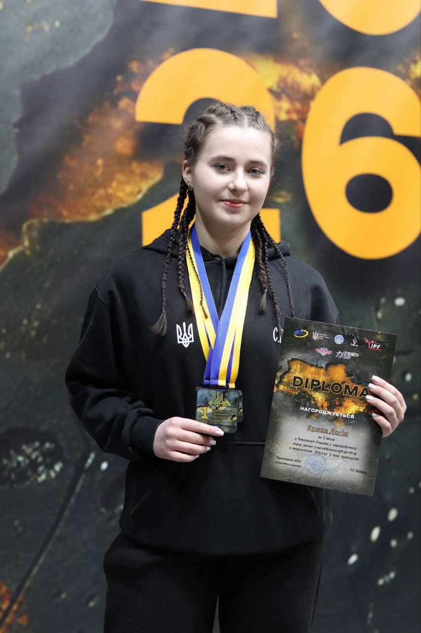 Ярина Логін — 🥇 I місце у ваговій категорії до 69 кг. серед дівчат за сумою триборства (присідання — I місце, жим — I місце, тяга — 🥉 III місце) — справжній зразок цілеспрямованості та сили.