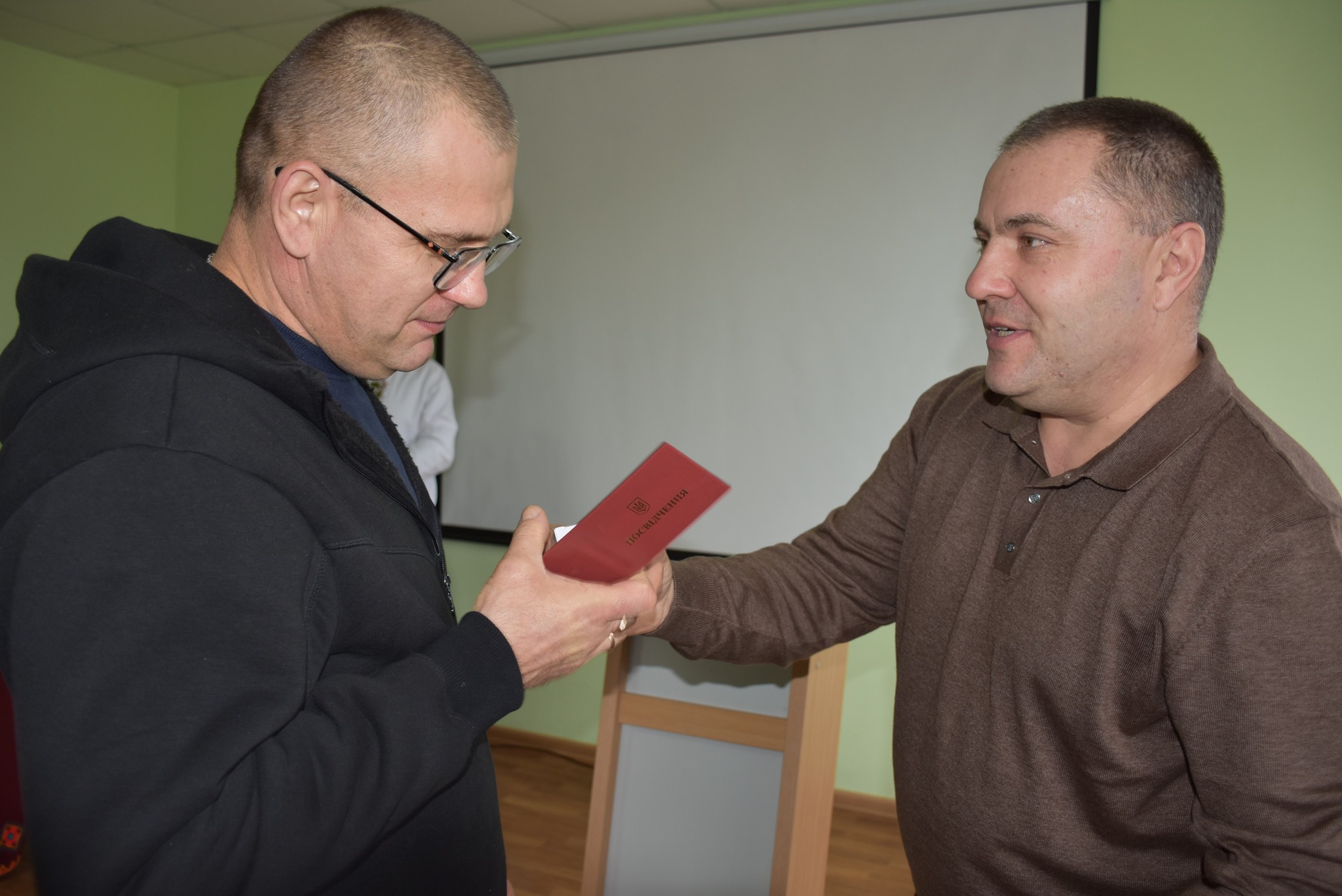 В’ячеслав Дмитрович Шевчук виконав приємну місію — вручив посвідчення і нагрудний знак «Ветеран праці» диспетчеру Олександру Андрійовичу Кроліку та водію Андрію Григоровичу Стрільцю.