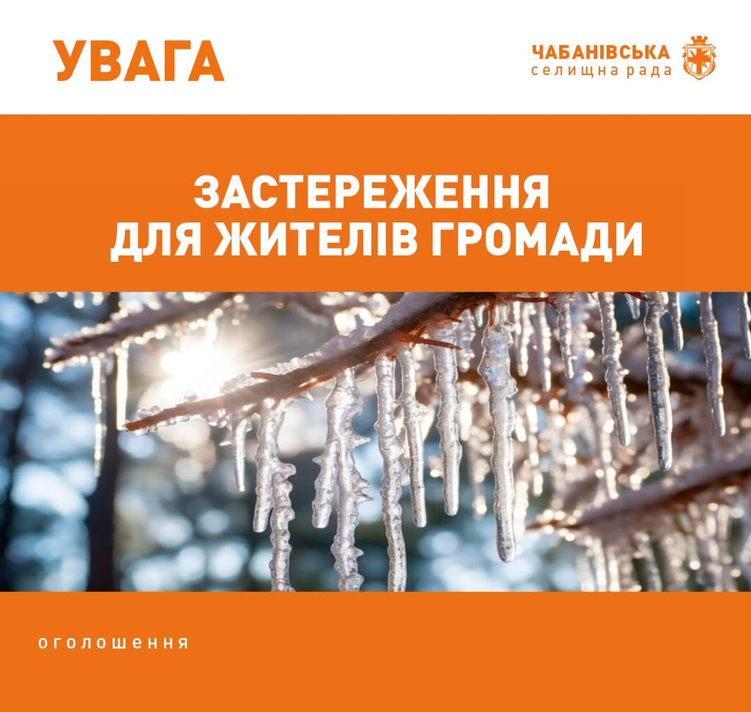 У зв’язку з погіршенням погодних умов та утворенням обледеніння на деревах, гілках і лініях електропередач, просимо жителів громади бути особливо уважними та дотримуватися заходів безпеки.