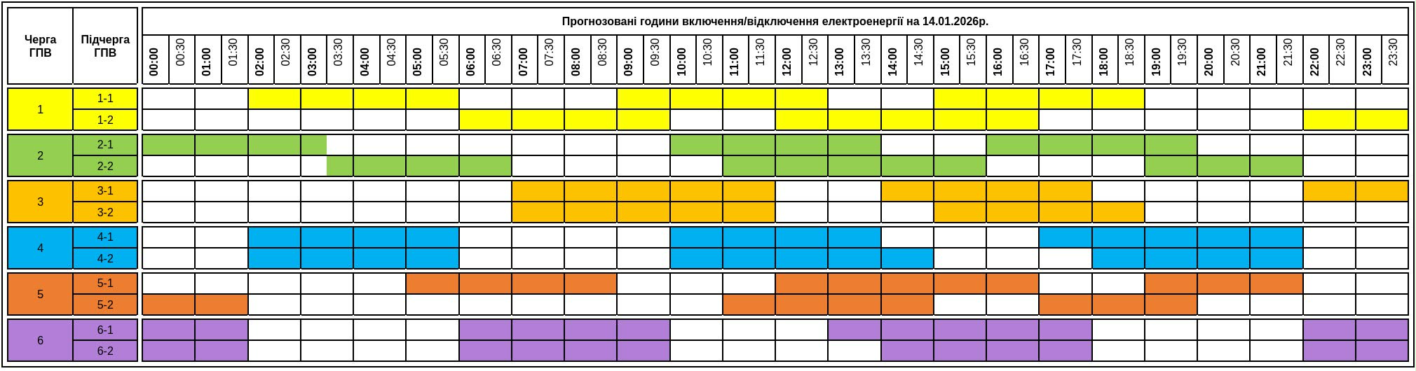 До уваги споживачів графік погодинних включень/відключень електроенергії на 14.01.2026