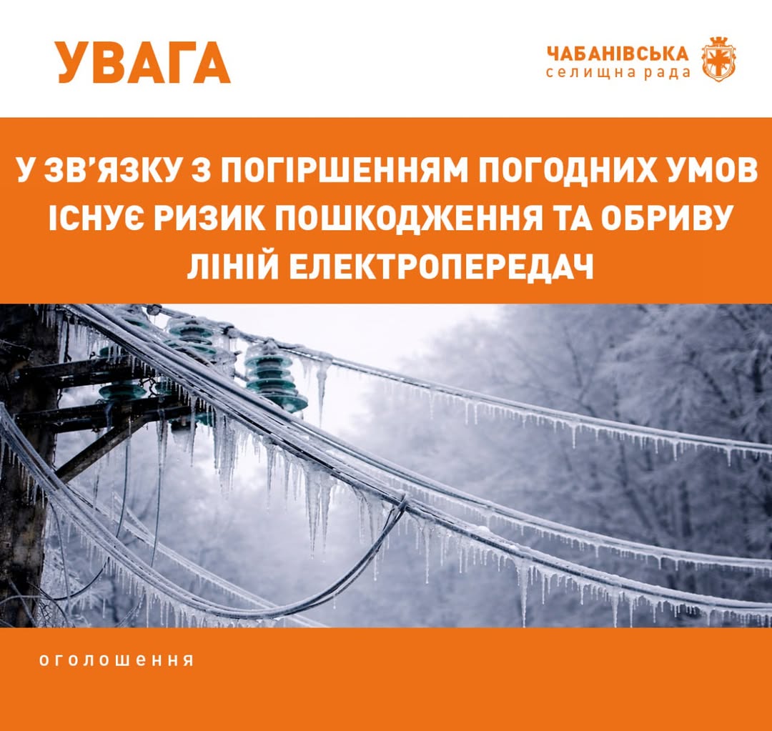 У зв’язку з погіршенням погодних умов існує ризик пошкодження та обриву ліній електропередач. Застерігаємо жителів громади: