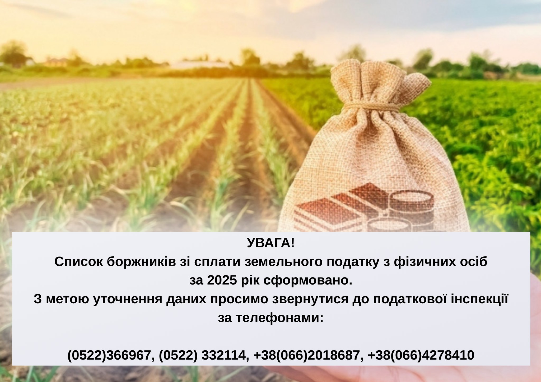 УВАГА! Нагадуємо про необхідність своєчасної сплати земельного податку з фізичних осіб.