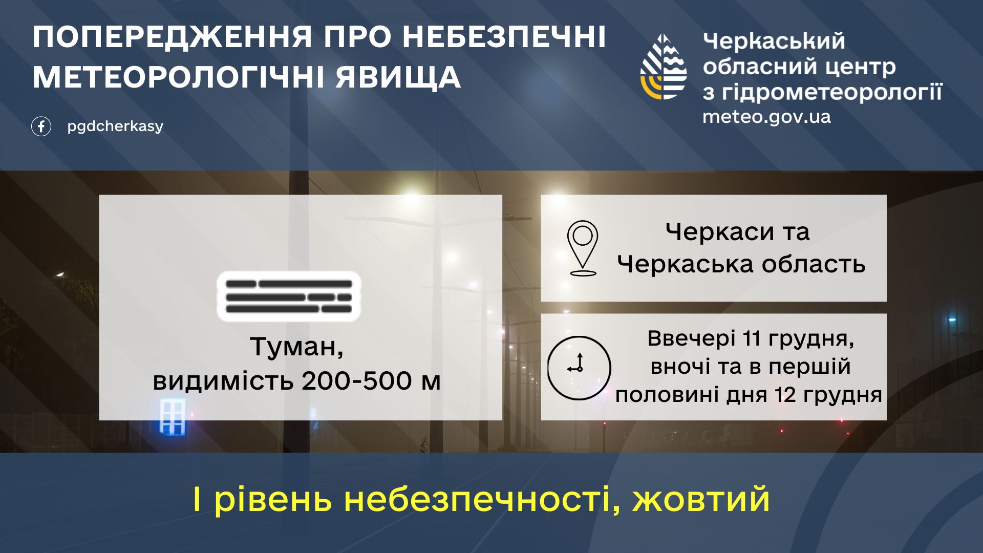 ‼️УВАГА ‼️ Попередження про небезпечні метеорологічні явища Ввечері 11 грудня, вночі та в першій половині дня 12 грудня по Черкаській області та м. Черкаси туман, видимість 200-500 м. I рівень небезпечності, 🟡