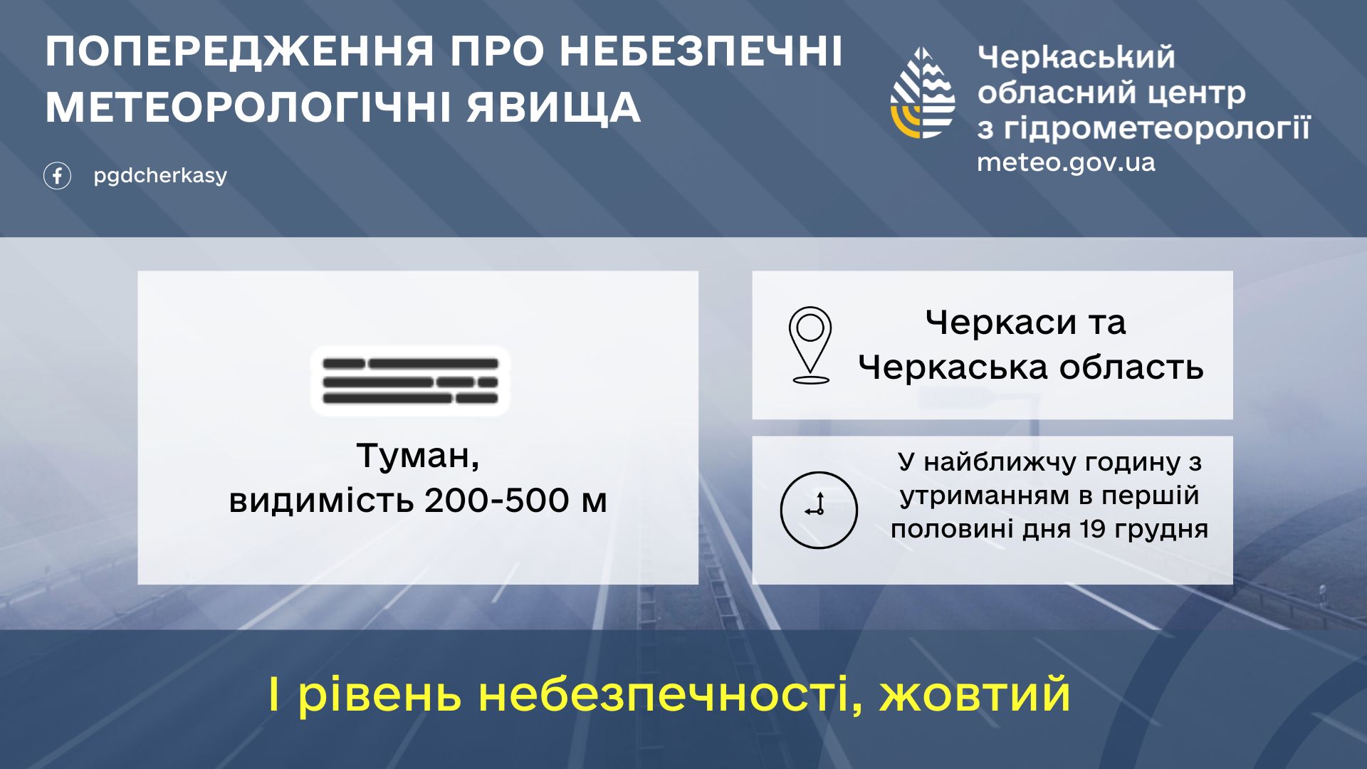 ‼️УВАГА ‼️ Попередження про небезпечні метеорологічні явища У найближчу годину з утриманням в першій половині дня 19 грудня по Черкаській області та м. Черкаси туман, видимість 200-500 м. I рівень небезпечності, 🟡