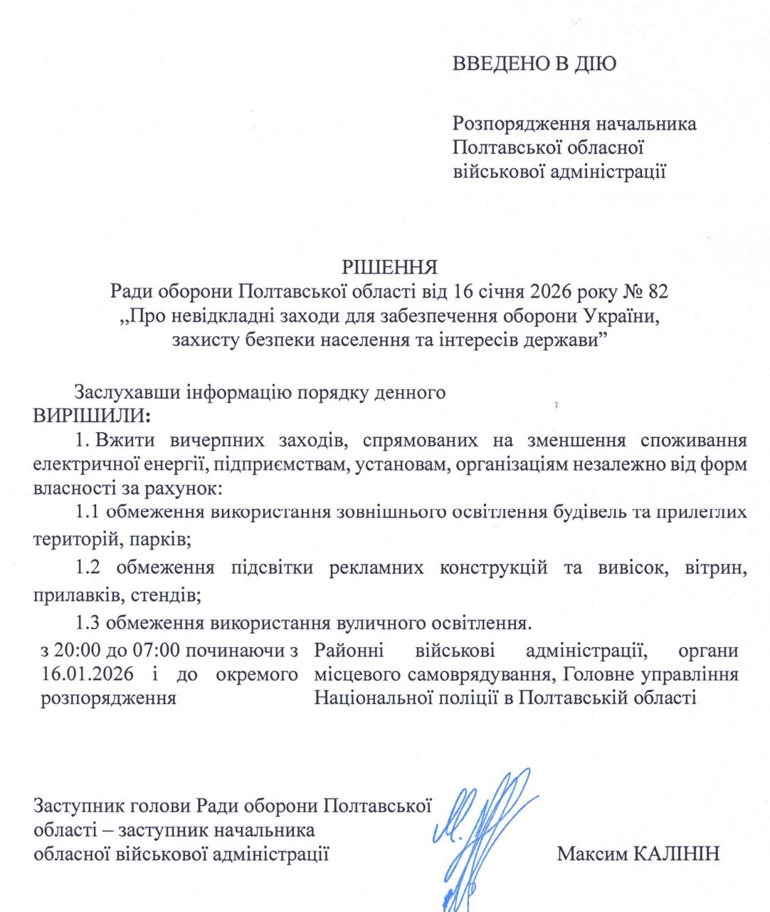 Відповідно до рішення Ради оборони Полтавської області, введеного в дію розпорядженням начальника Полтавської обласної військової адміністрації 16 січня 2026 року, в області запроваджено додаткові заходи з енергозбереження.