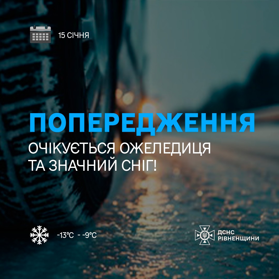 За повідомленням Рівненського обласного центру з гідрометеорології, протягом доби 15 січня на території Рівненської області та в місті Рівне на дорогах очікується ожеледиця та значний сніг!