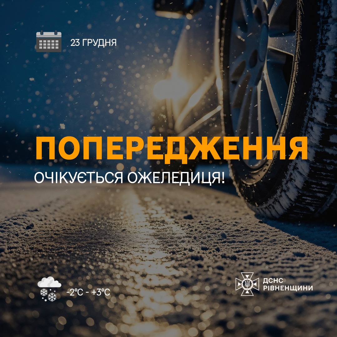 За інформацією Рівненського обласного центру з гідрометеорології, 23 грудня по Рівненській області та м. Рівному на дорогах очікується ожеледиця.