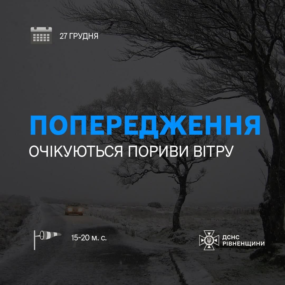 За інформацією Рівненського обласного центру з гідрометеорології, 27 грудня по Рівненській області та м. Рівному на дорогах ожеледиця. Протягом доби очікуються пориви північно-західного вітру 15-20м/с!