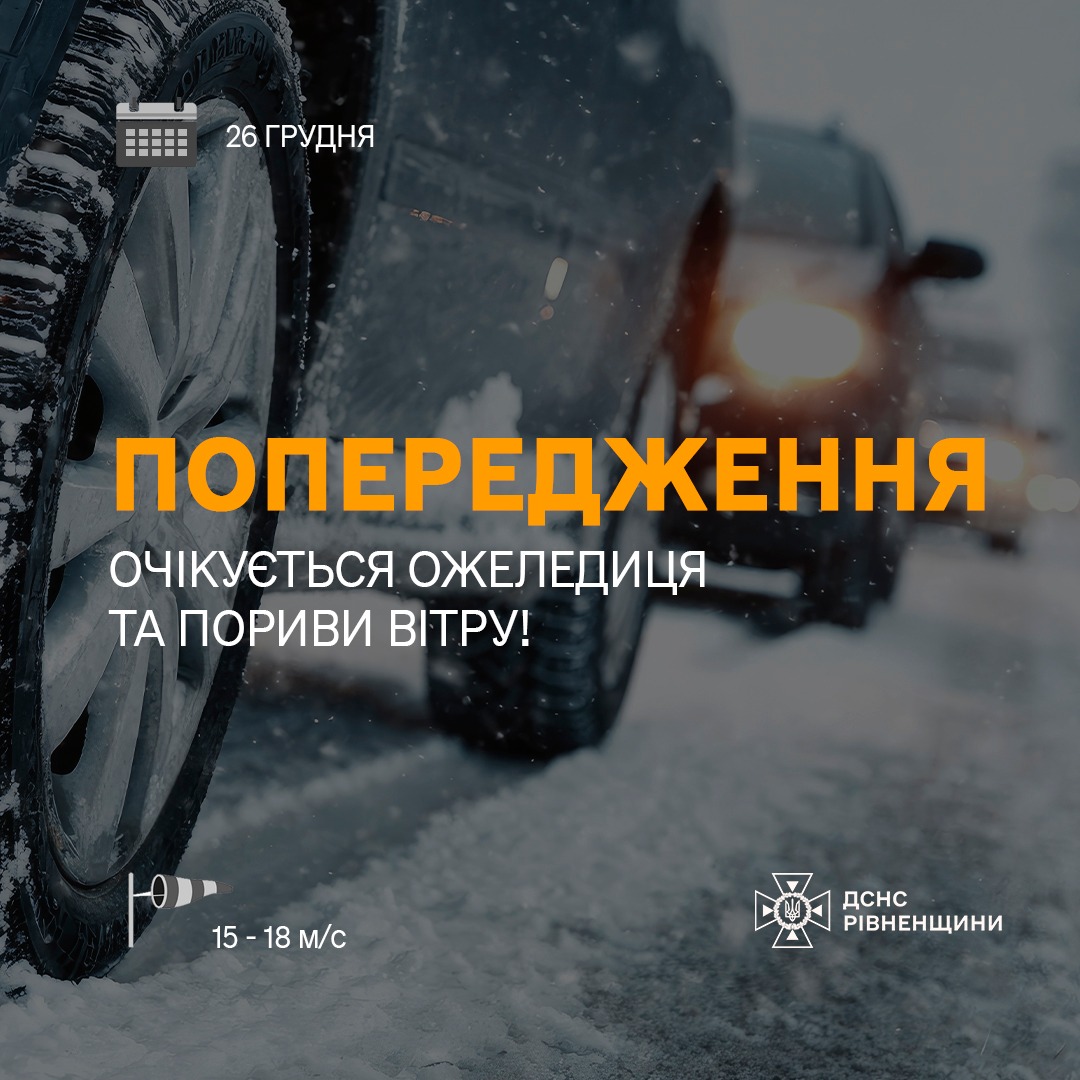 За інформацією Рівненського обласного центру з гідрометеорології, 26 грудня по Рівненській області та м. Рівному на дорогах ожеледиця. Вдень очікуються пориви північно-західного вітру 15-18м/с!
