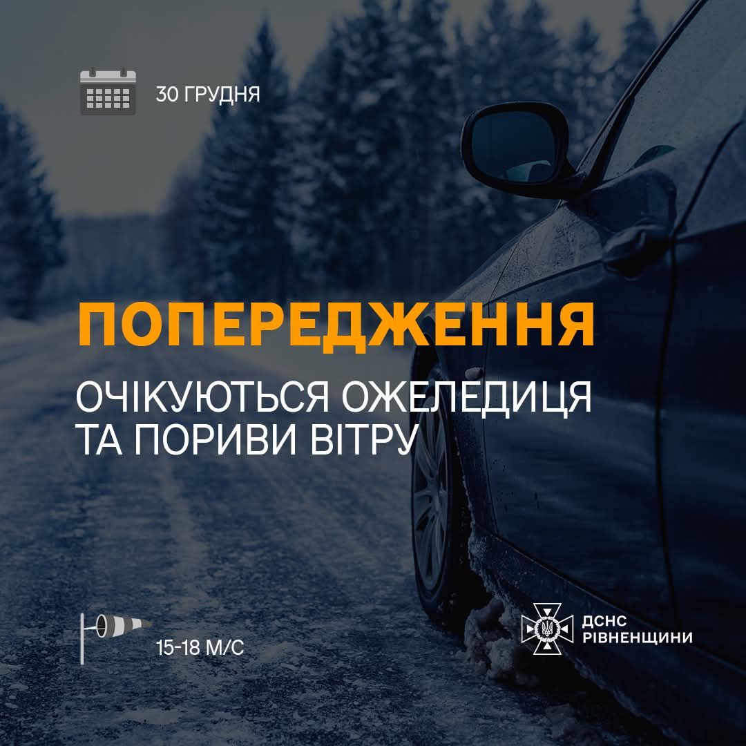 За інформацією Рівненського обласного центру з гідрометеорології, 30 грудня по Рівненській області та м. Рівному на дорогах ожеледиця. Протягом доби очікуються пориви північно-західного вітру 15-18м/с!