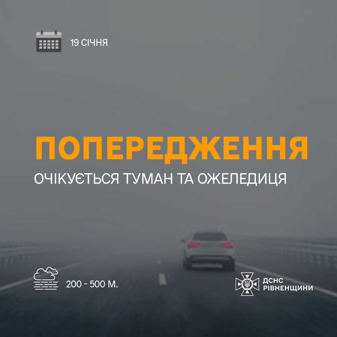 За інформацією Рівненського обласного центру з гідрометеорології, 19 січня по м. Рівне та Рівненській області очікується туман з видимістю 200–500 м.