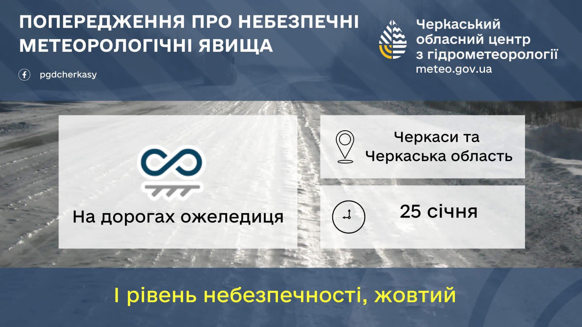 ❗Увага❗ Попередження про небезпечні метеорологічні явища. 25 січня по Черкаській області та м. Черкаси на дорогах ожеледиця. I рівень небезпечності, 🟡
