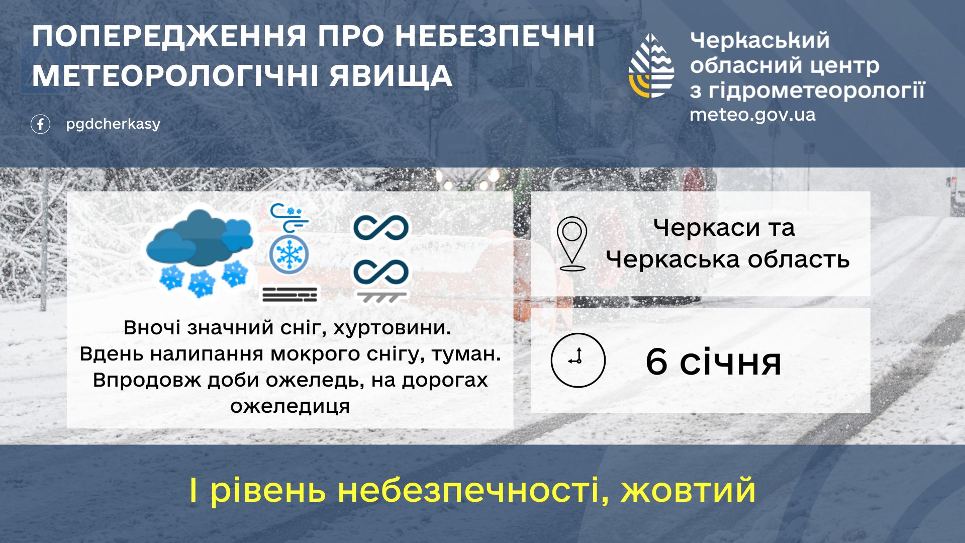 Вночі 6 січня по Черкаській області та м. Черкаси значний сніг (7-19 мм за 12 год. і менше), хуртовини. Вдень налипання мокрого снігу (11-20 мм), туман, видимість 200-500 м. Впродовж доби ожеледь (6-15 мм), на дорогах ожеледиця.