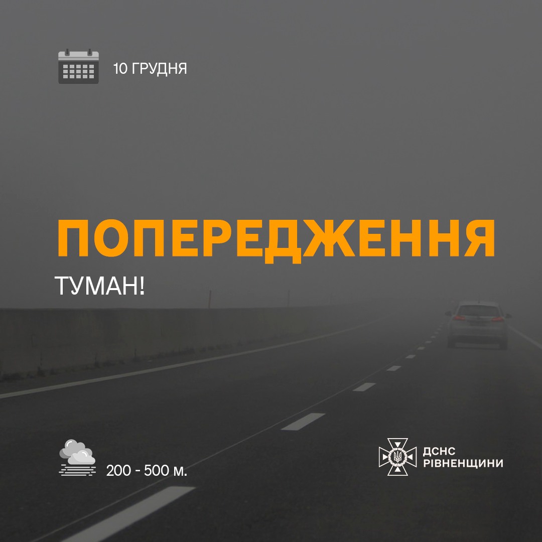 За інформацією Українського гідрометеорологічного центру, 10 грудня в першій половині дня по м. Рівне та області туман із видимістю 200–500 метрів.