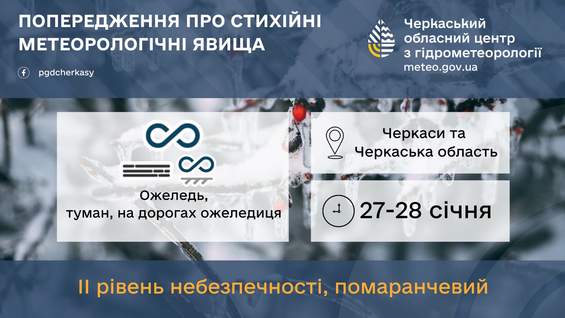 В другій половині дня з утриманням до кінця доби 27 січня 2026 року та впродовж доби 28 січня 2026 року по Черкаській області та м. Черкаси сильна ожеледь (20-30 мм). Вночі та вдень 28 січня 2026 року туман, видимість 200-500 м, на дорогах ожеледиця