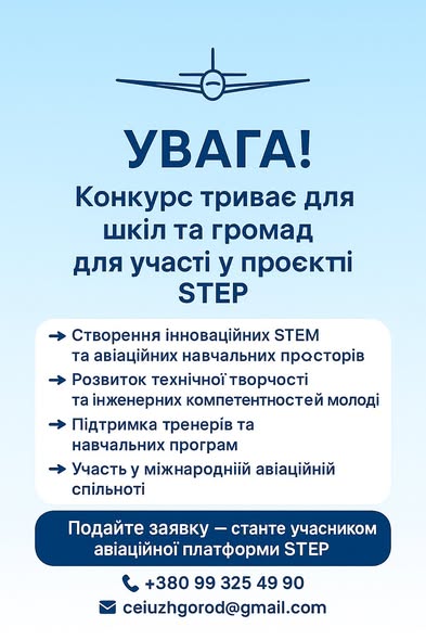 Проєкт STEP – Освітньо-тренінгова платформа сталого навчання реалізується за фінансової підтримки Програми Interreg VI-A NEXT Румунія–Україна 2021–2027. Його мета — забезпечити рівний доступ до якісної освіти та сучасних освітніх технологій для молоді прикордонних територій, сприяти розвитку технічної творчості, інженерного мислення та навичок у сфері авіації.