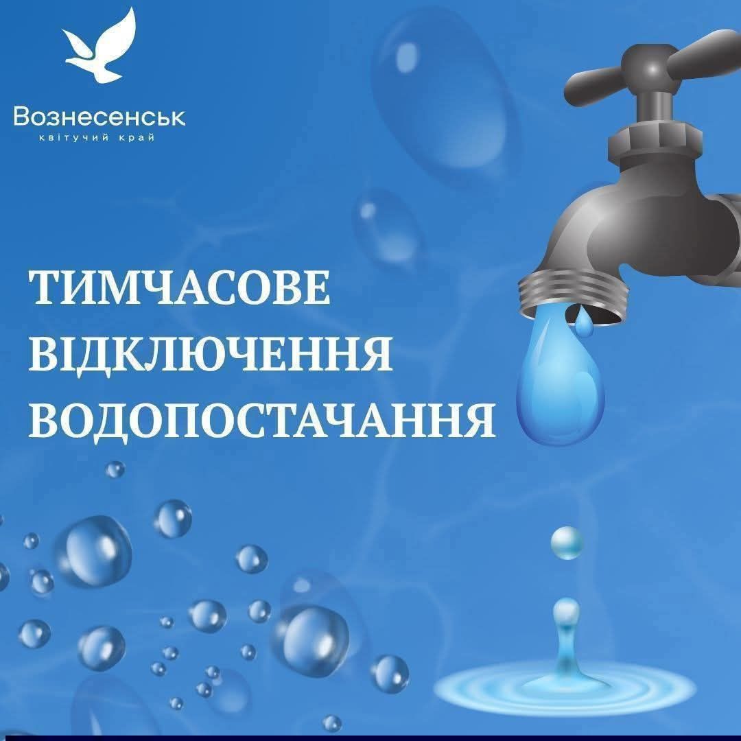 у зв’язку із застосуванням графіків аварійних відключень електроенергії та тимчасовою зупинкою роботи ТОВ «БОС» (біологічно-очисні споруди) через переповнення резервуарів для перекачування стічних вод, КП «Водопостачання міста Вознесенська» змушене призупинити подачу води з 21:00 24 січня до 05:00 25 січня.