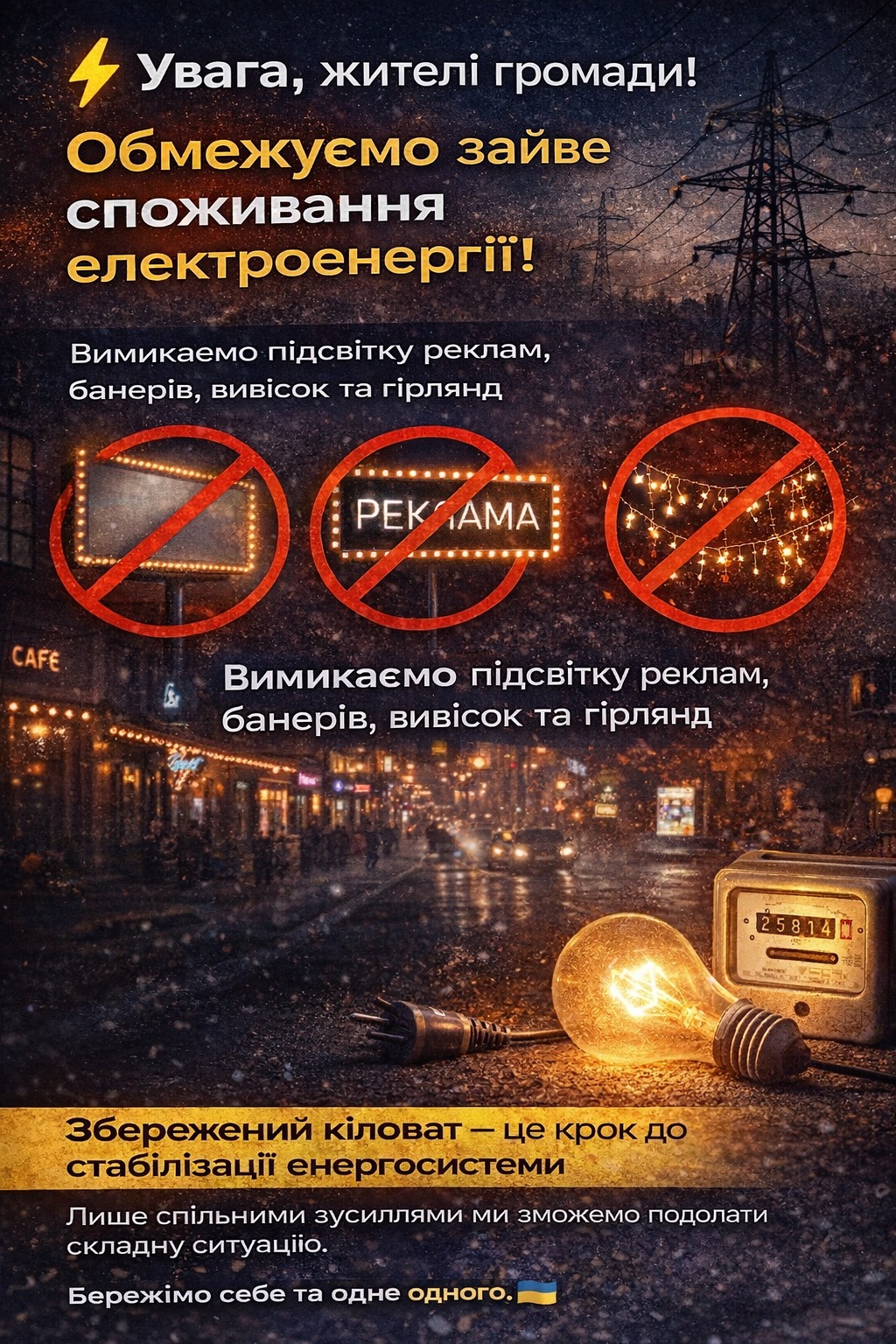 У зв’язку з надскладною ситуацією в електромережах України закликаємо всіх максимально відповідально ставитися до споживання електроенергії. Просимо по можливості обмежити будь-яке зайве використання електрики, зокрема вимкнути підсвітку реклам, банерів, вивісок, гірлянди та інші не першочергові електроприлади.
