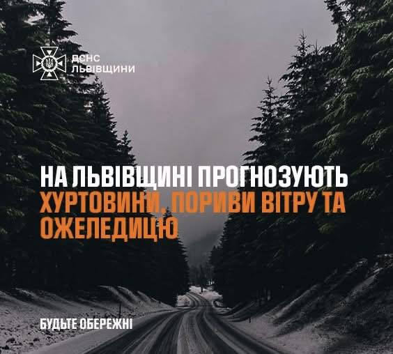 На Львівщині протягом дня очікуються пориви південно-західного вітру 15–20 м/с, хуртовини та ожеледиця на дорогах.