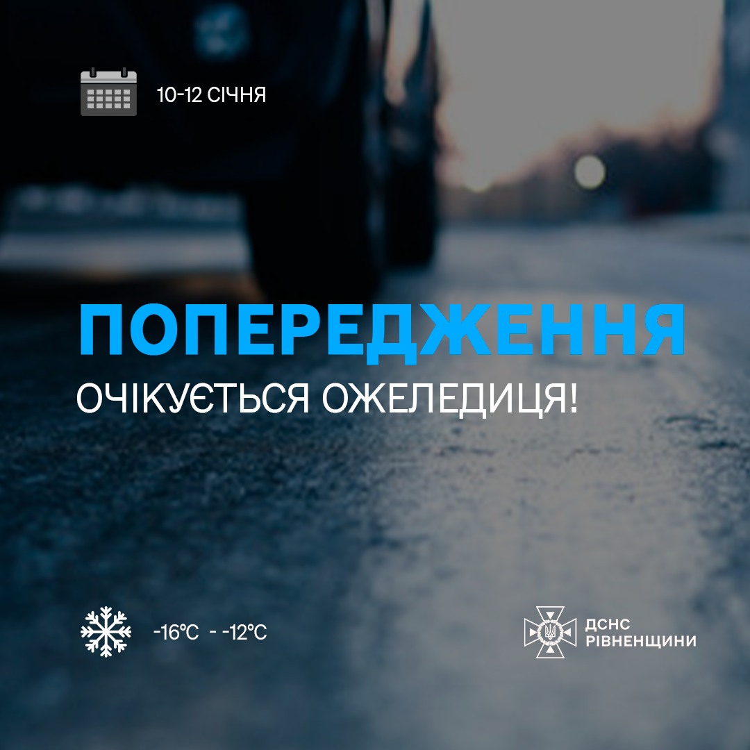 За інформацією Рівненського обласного центру з гідрометеорології, 10-12 січня у Рівному та області на дорогах очікується ожеледиця.