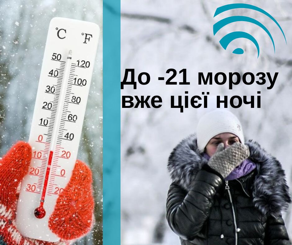 🌡Температура вночі 13-18°морозу, місцями до 21°морозу,