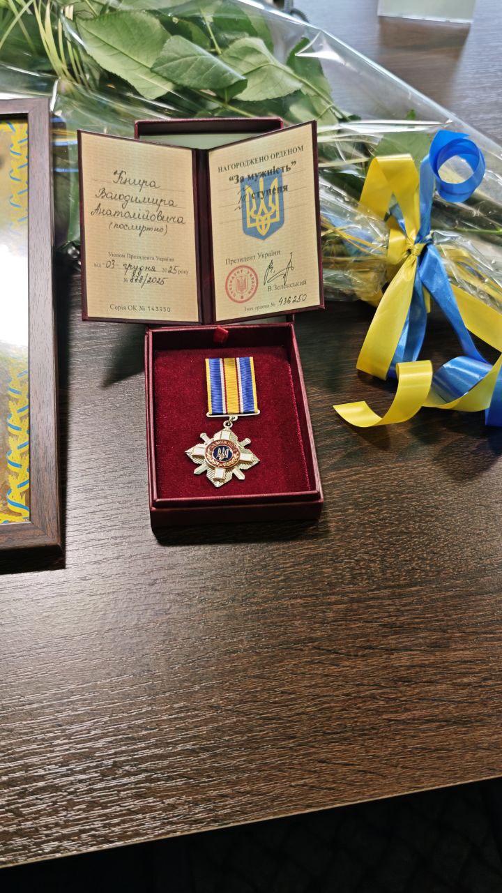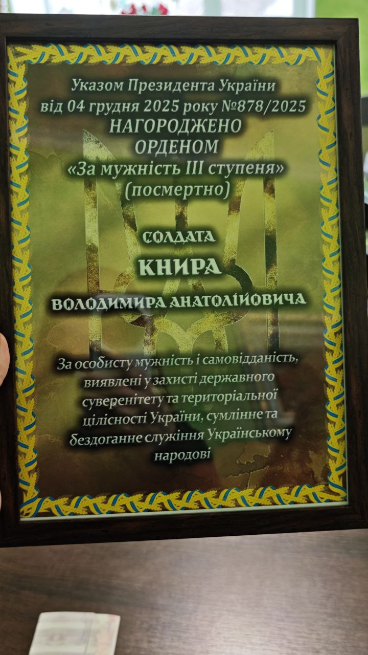 Указом Президента України від 04 грудня 2025 року №878/2025, нагороджено Орденом «За мужність» III ступеня (посмертно) солдата Книру Володимира Анатолійвича.